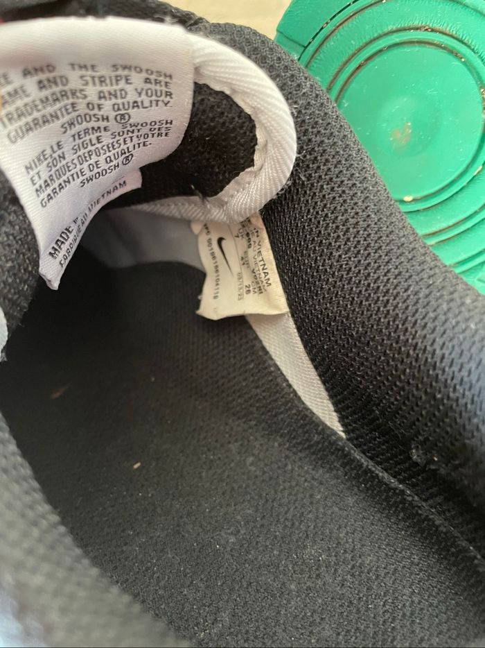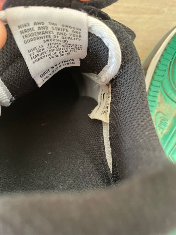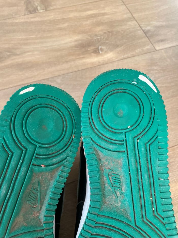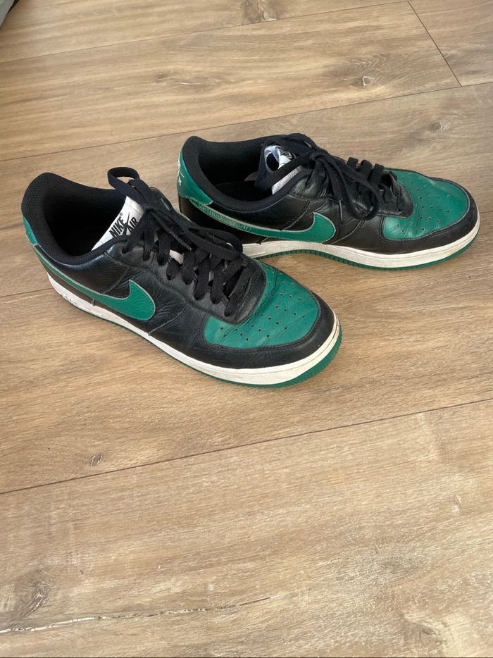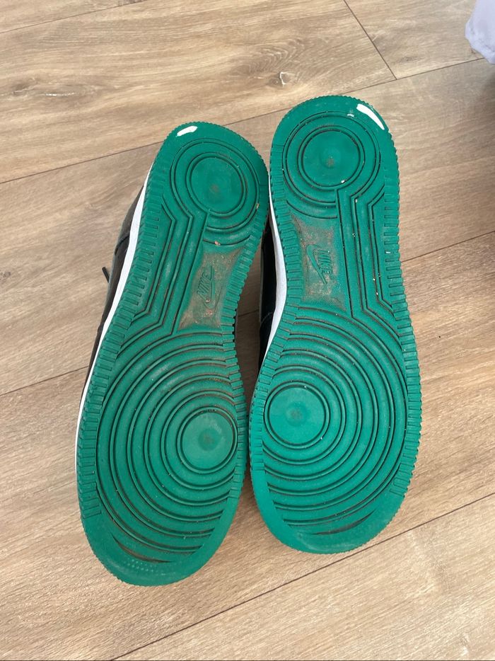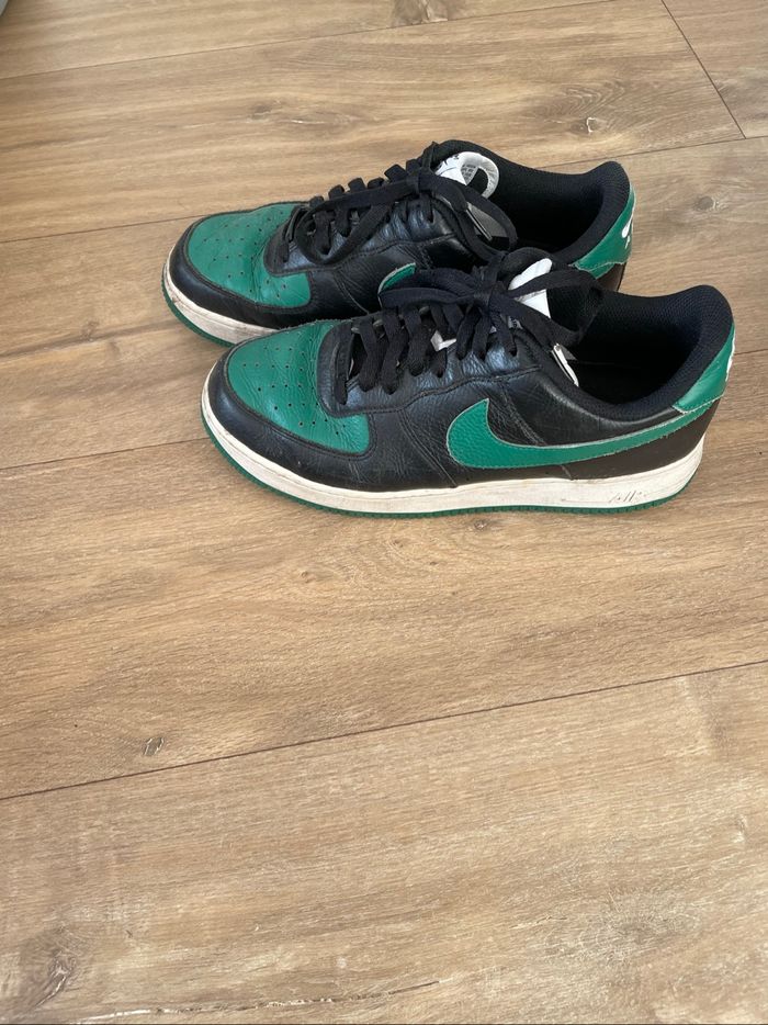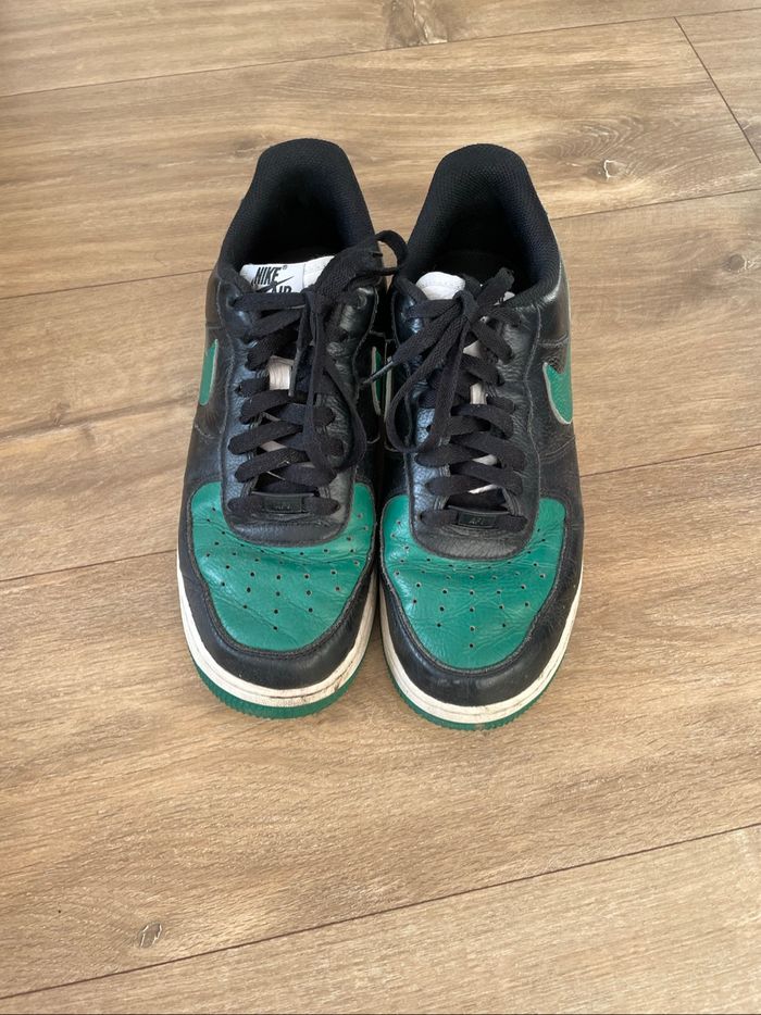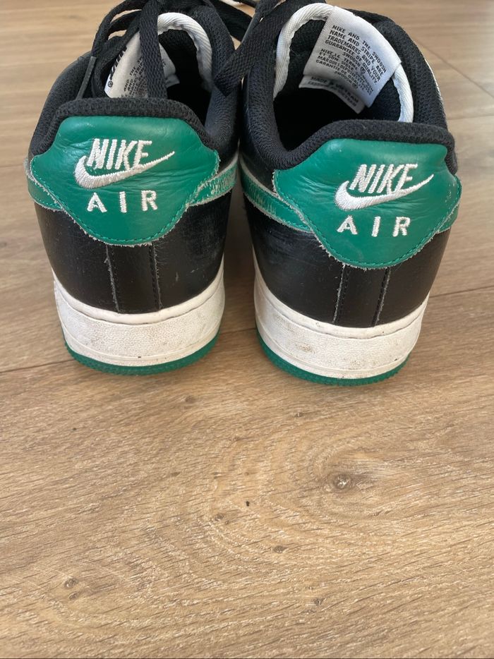 Vends paire de baskets noir et vert, de marque et modèle Nike Air Force 1, pointure 41, en bon état bien que les semelles soient légèrement abîmées.