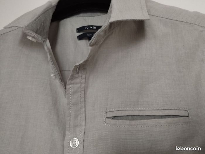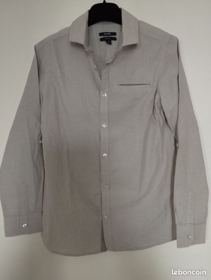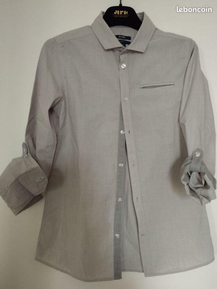 Chemise habillée Slim fit pour garçon 12ans coloris gris clair avec le revers des manches et devant boutonnage gris plus foncé. Les manches peuvent se remonter grâce à une pate boutonné à l'intérieur. Très peu porté.