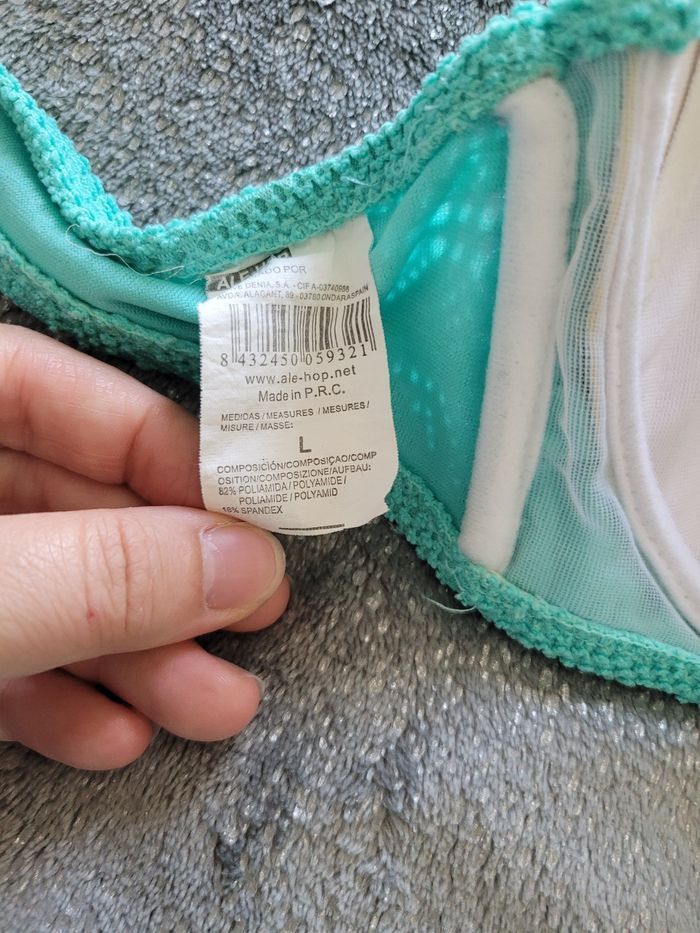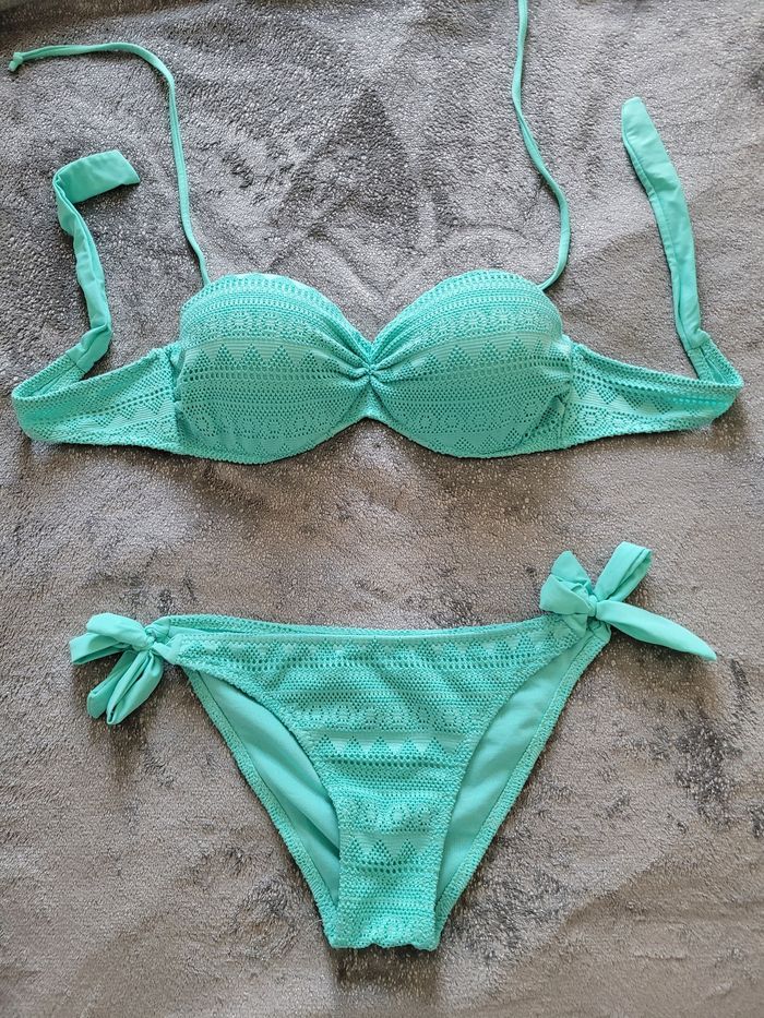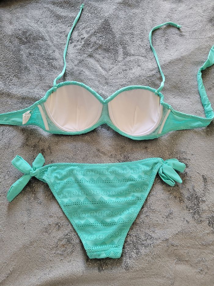 Maillot de bain bleu : haut taille L (85D) et bas tanga taille S/M (36/38). Quasiment pas porté car acheté plusieurs et après j'ai changé de taille.