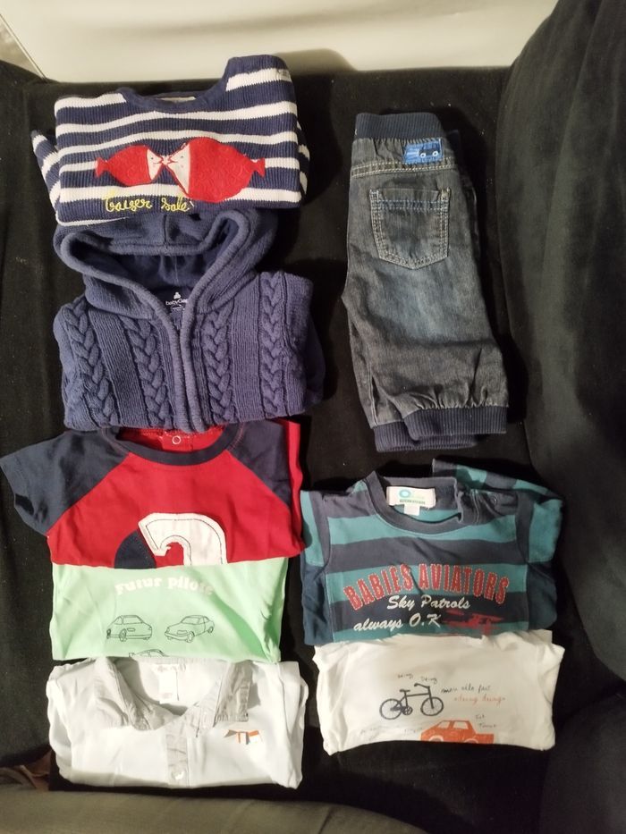 A vendre lot vêtements bébé garçon ou mixte 2 bodys manches courtes 2 bodys manches longues 4 pyjamas chauds 2 T-shirts manches courtes 3 t-shirts manches longues 1 pull 1 gilet zippé avec capuche 1 pantalon Différentes marques (Verbaudet, Obaïbi, Kiabi, Du pareil au même, Baby Gap...) Certains vêtements sont en bon état et d'autres quasiment neufs. Vente en lot ou unité