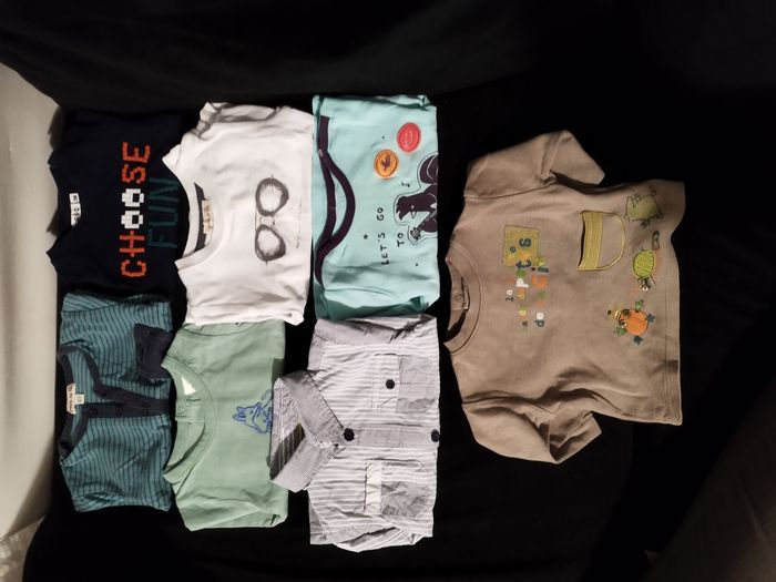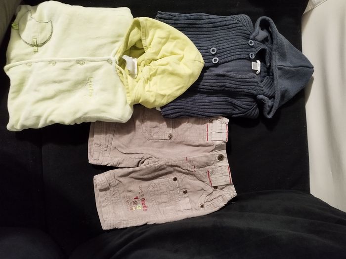 A vendre lot vêtements bébé hiver garçon 2 bodys manches courtes 2 bodys manches longues 1 pyjama très chaud 3 pyjamas chauds 1 chemisette 2 T-shirts manches courtes 3 t-shirts manches longues 1 sweat 1 gilet sans manche avec capuche (il ressort jaune sur la photo mais il est vert anis) 2 gilets boutons avec capuche 1 pantalon velours 1 salopette Différentes marques (Verbaudet, Obaïbi, Gémo, Grain de blé, Tape à l'oeil...) Certains vêtements sont en bon état et d'autres quasiment neufs. Vente en lot ou unité Plus de détails et photos sur demande