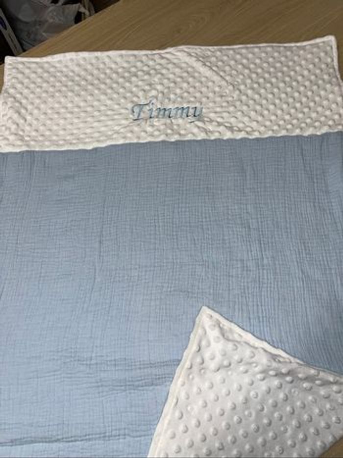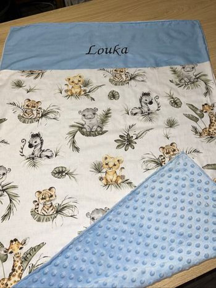 Plaid fait main taille environ 70x100 cm Tissu au choix Une face imprimé avec prénom brodé Une face tissu tout doux mincky couleur au choix