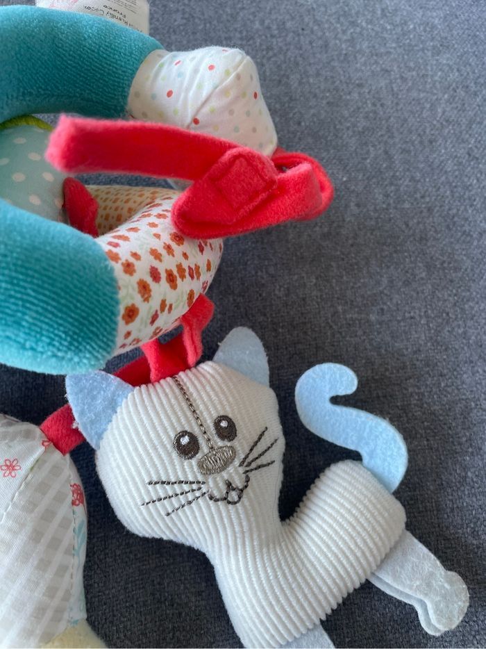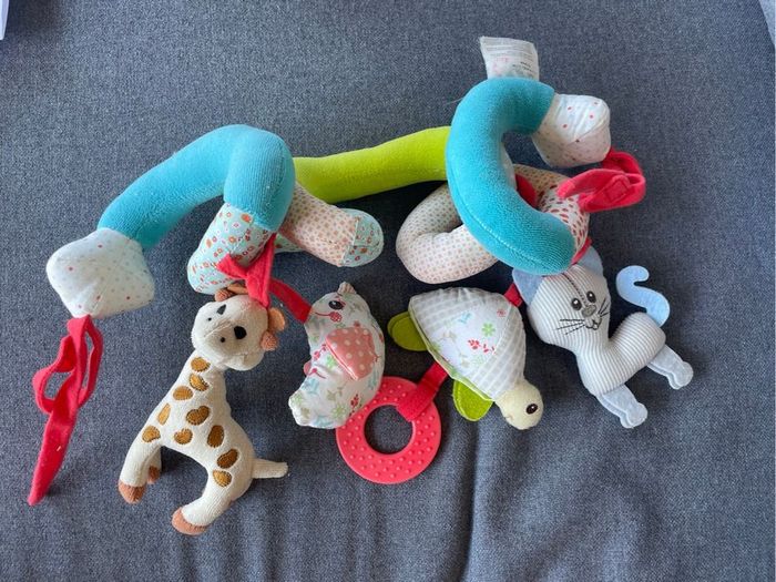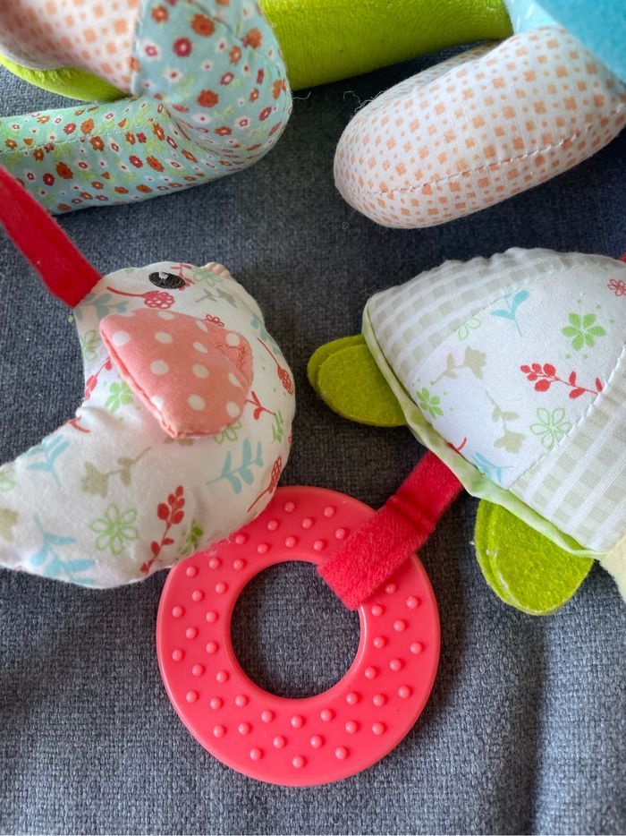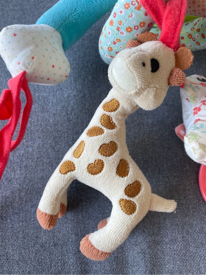Tbe Pour accrocher à la poussette ou sur un transat pour amuser bébé Petit grelot dans la girafe, oiseau qui fait un bruit de papier froissé quand on l’attrape, anneau à attraper.. S’attache avec des scratchs