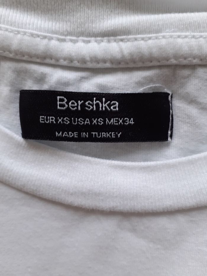 Vends un tee-shirt manches courtes, blanc avec motif devant, 100 % coton, marque Bershka, taille XS (EUR). Longueur sous aisselle : 40 cm. A noter : une toute petite trace jaune sur le devant en bas qui ne se verra pas si on porte le tee-shirt dans le jean.