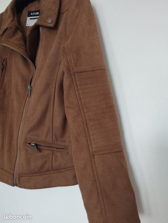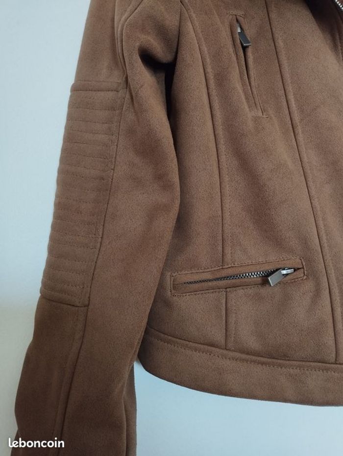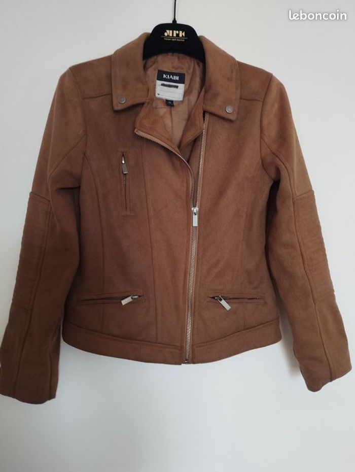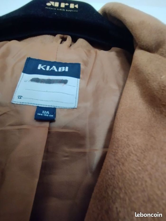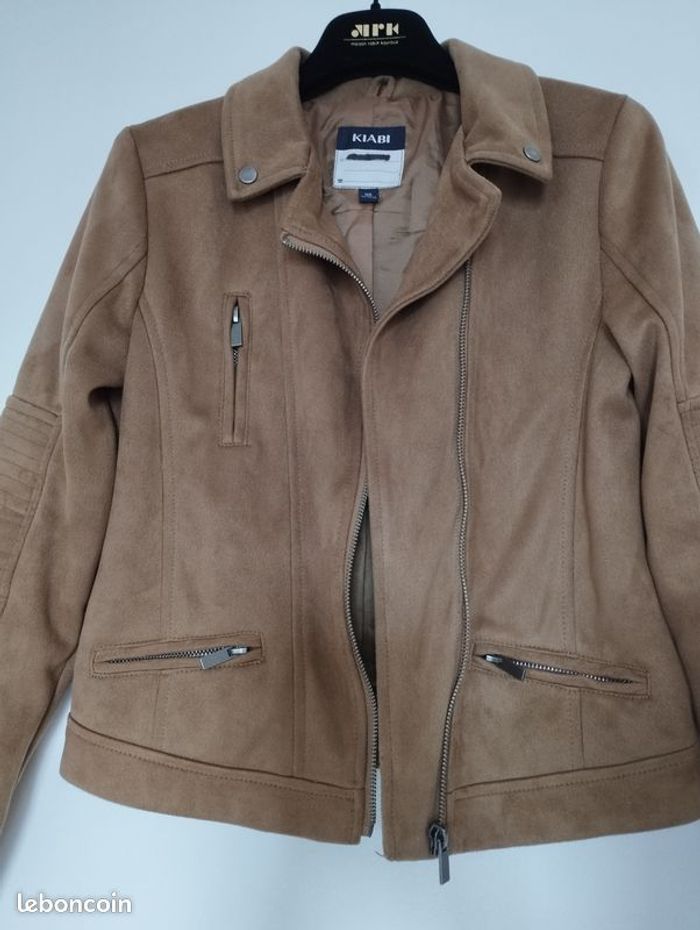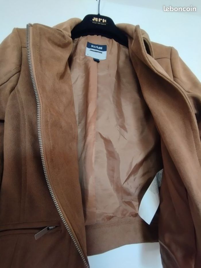 Veste stylée, très souple , bien confortable, imitation daim Couleur camel/chamois. Doublure intérieur impeccable , même couleur ! Pour enfant 12ans. Longueur 51.5cm. Marque Kiabi.