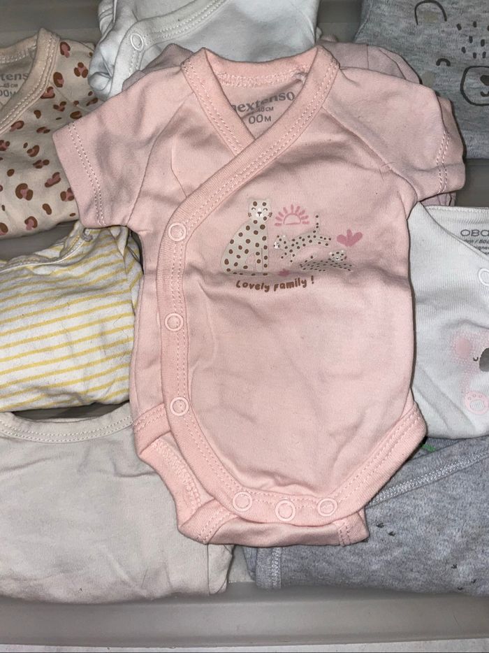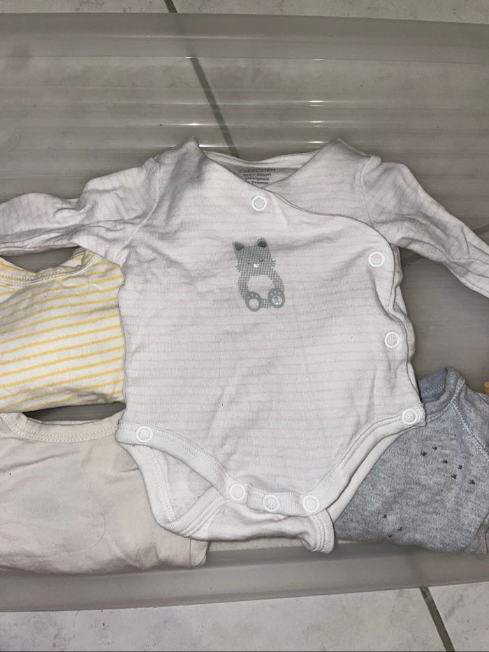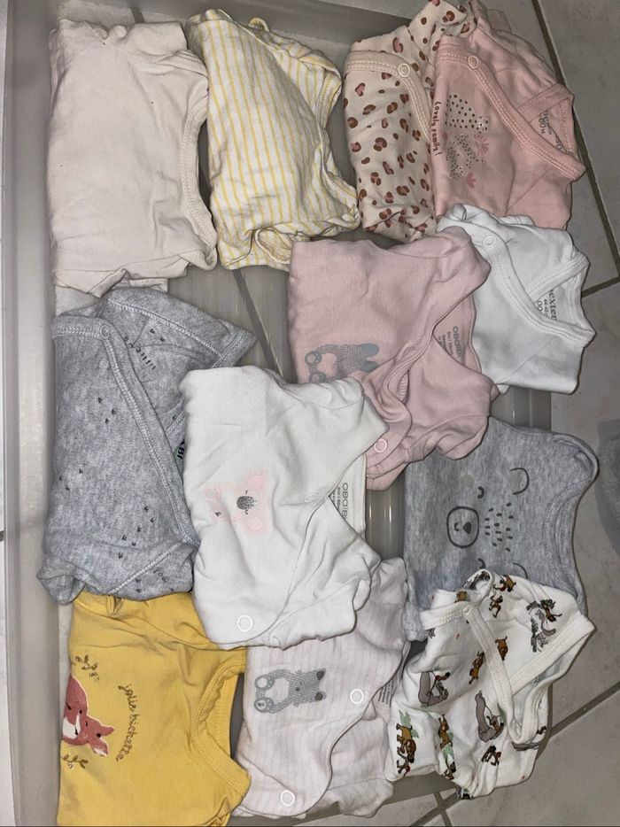 Lot de 12 body vous pouvez retrouver du Kiabi obaibi gémo ect (1€ le body sauf 1 légère tache et micro trous )