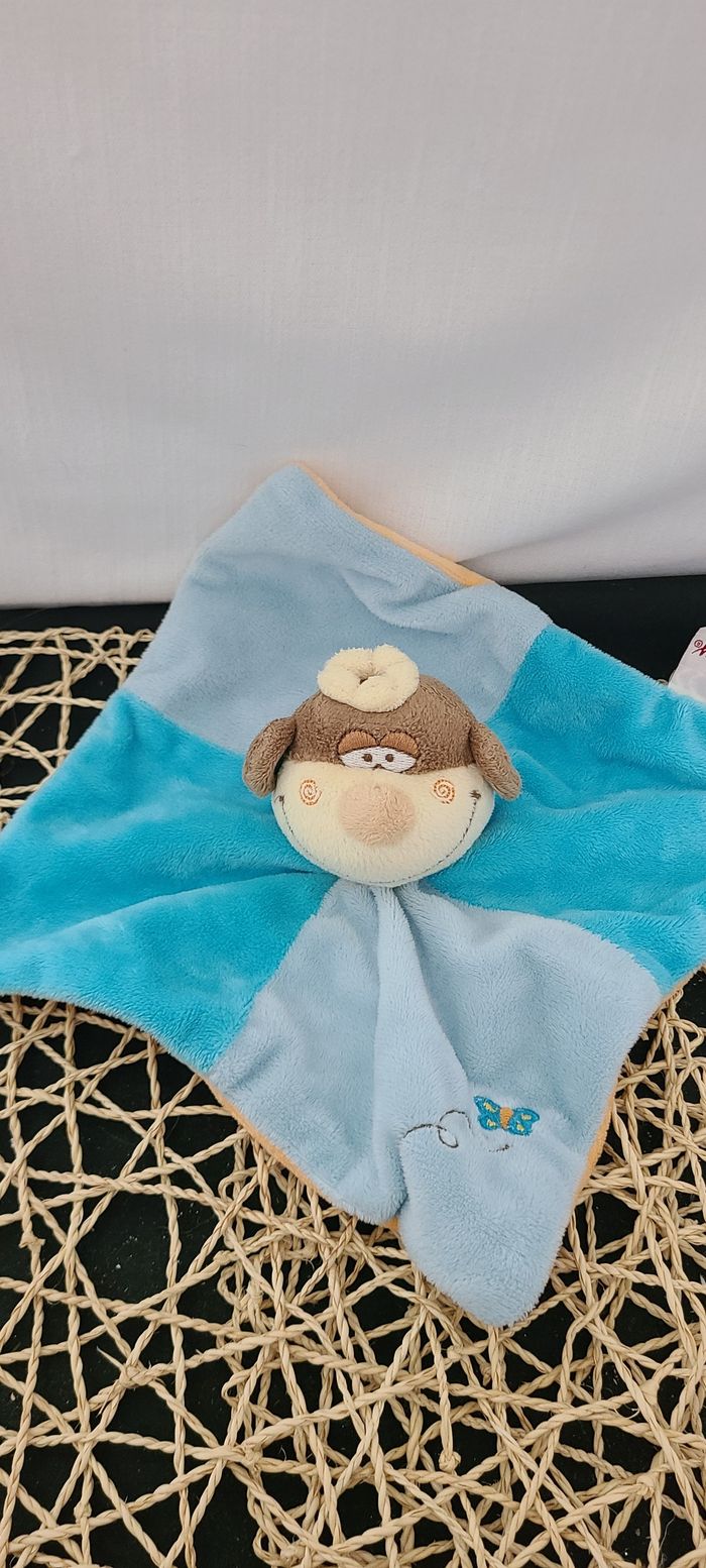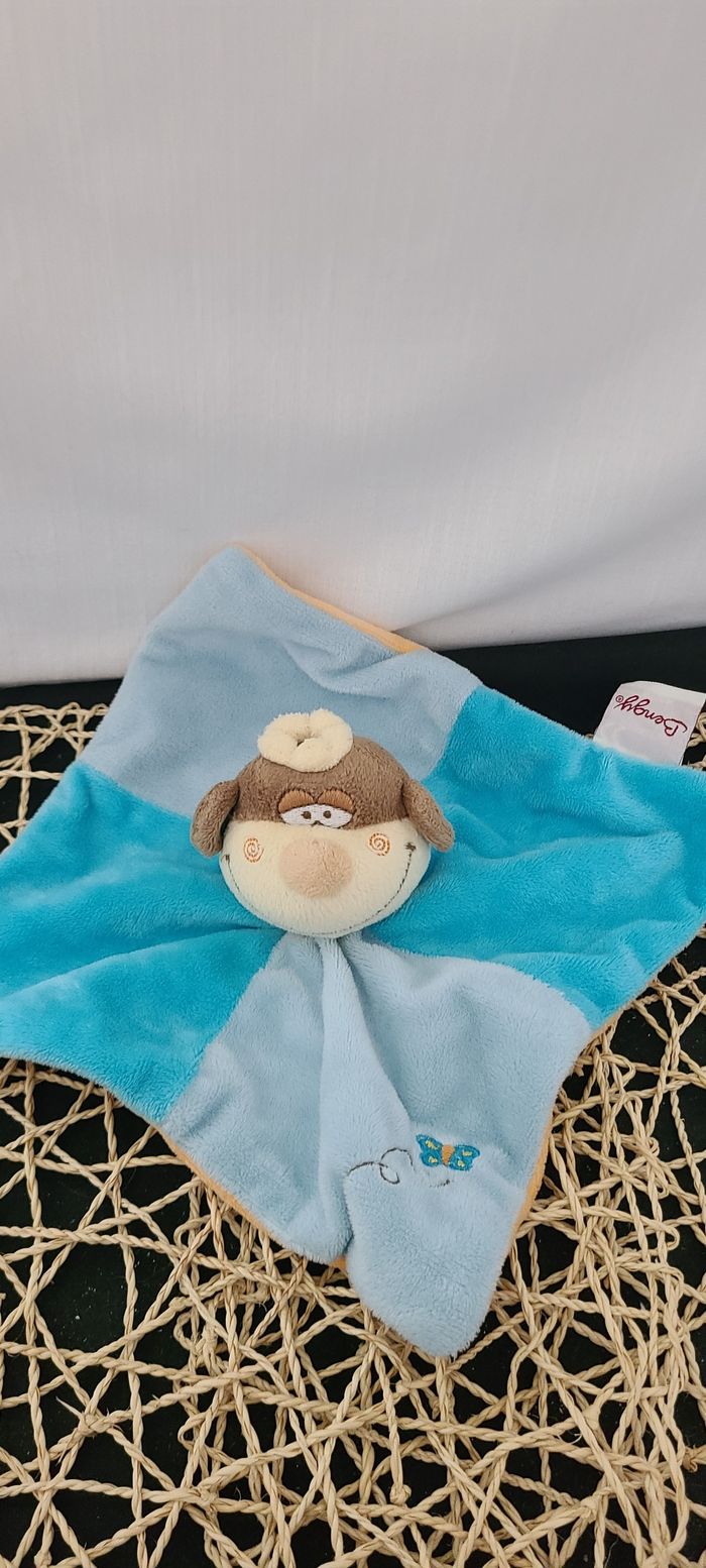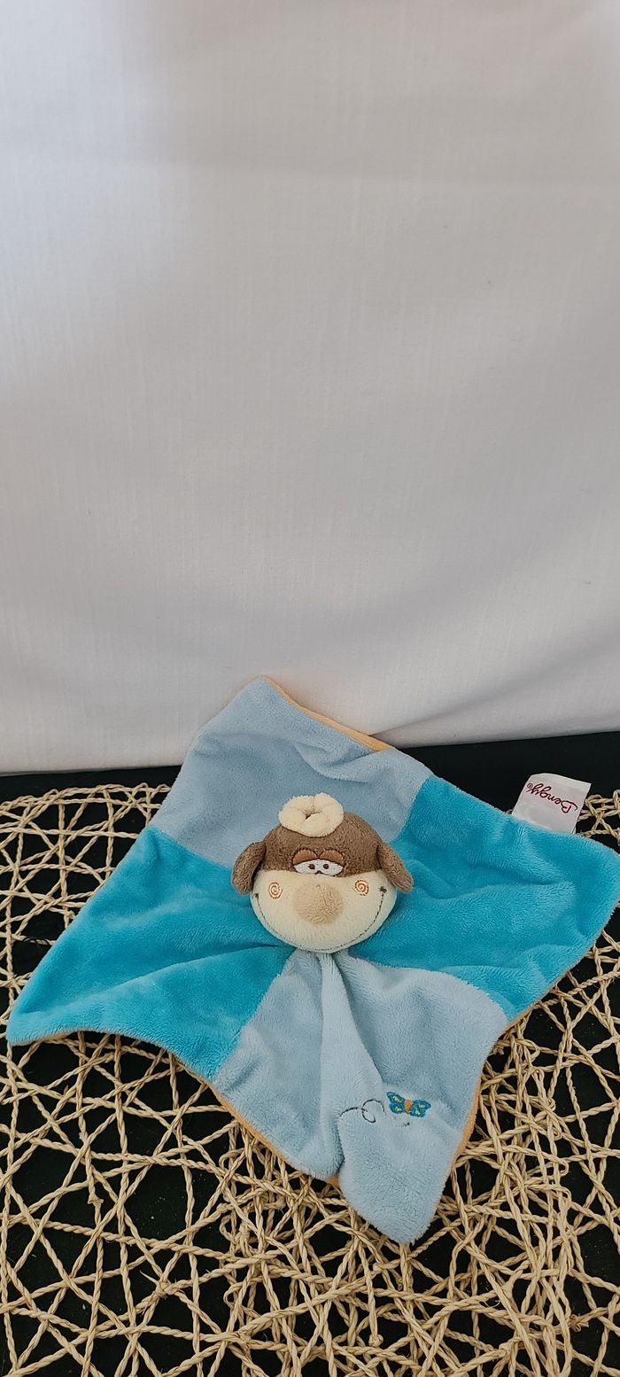 singe doudou carré plat bleu marron orange couronne jaune écharpe bengy