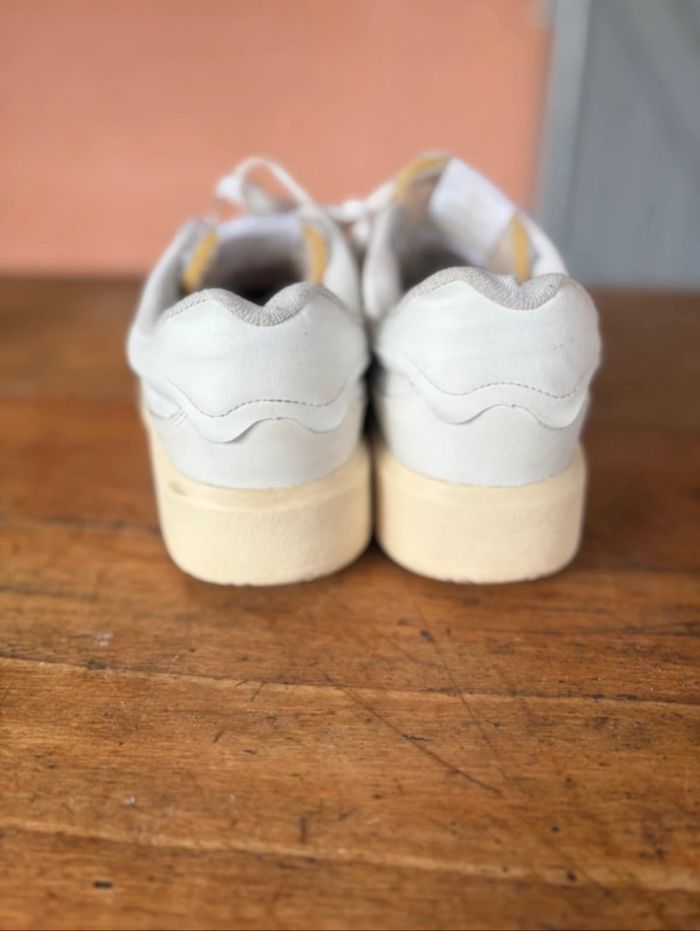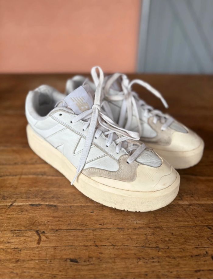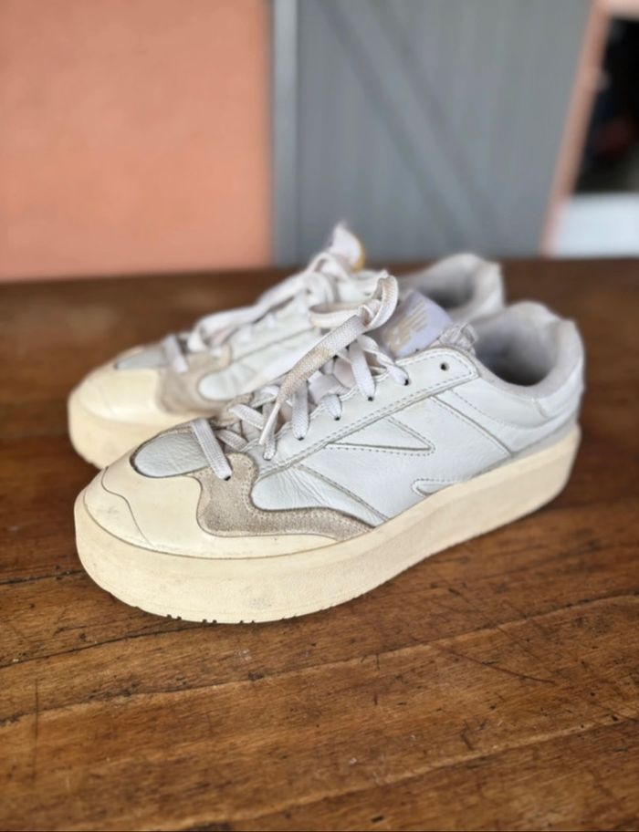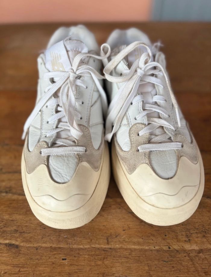 Sneakers New Balance en cuir et suédine, coloris blanc cassé/crème avec détails beige. État correct : traces d'usage visibles (semelles) mais encore beaucoup de vie. Très confortables, parfaites pour un look casual et vintage.