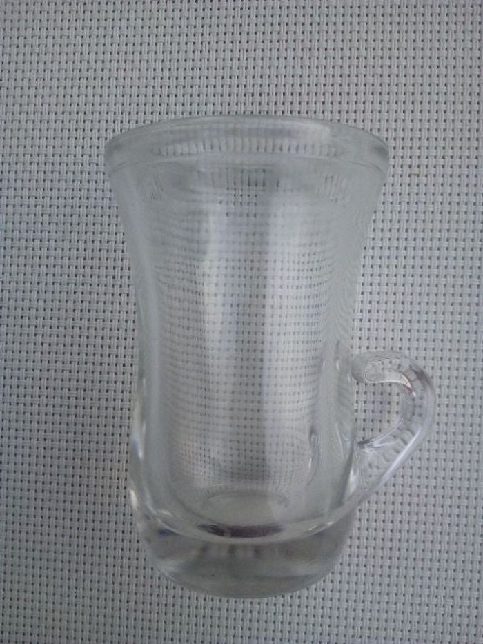 1 petit verre avec anse mesures 8 cms de hauteur sur 5 cms de diamètre voir toutes mes annonces en tapant kiki60230