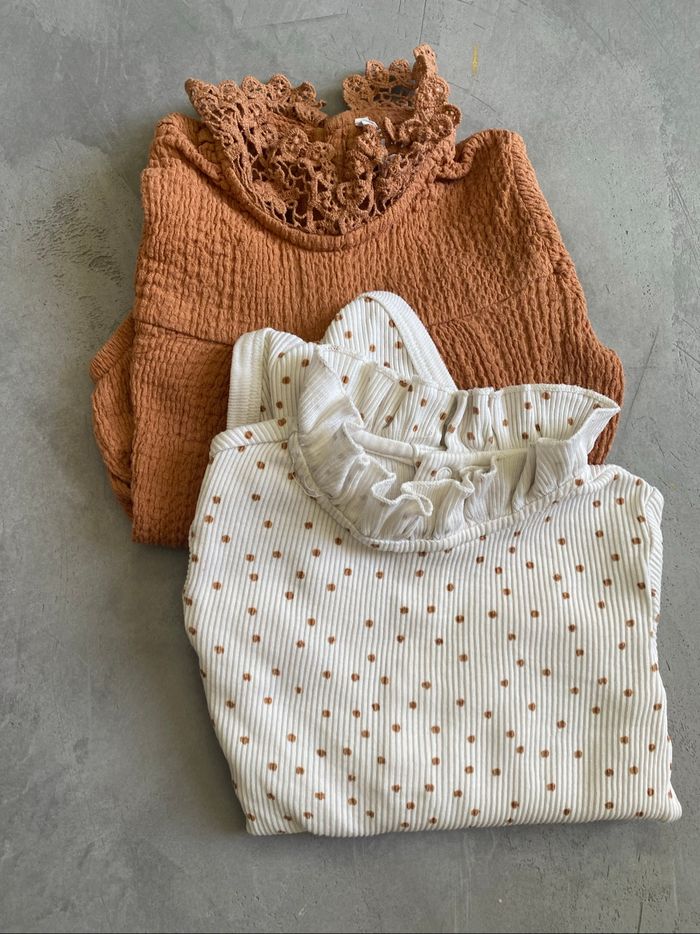 Je vends ce lot de vêtements pour bébé : DIFFÉRENTES TAILLES : - 0/1mois : 1 gilet en maille blanche, 1 body rose, - 3 mois : 1 robe à motifs fruits, 1 tee-shirt manche longue avec broderies, 1 body rose petit bateau - 6/9 mois : 2 body avec col froufrou à pois et unis caramel