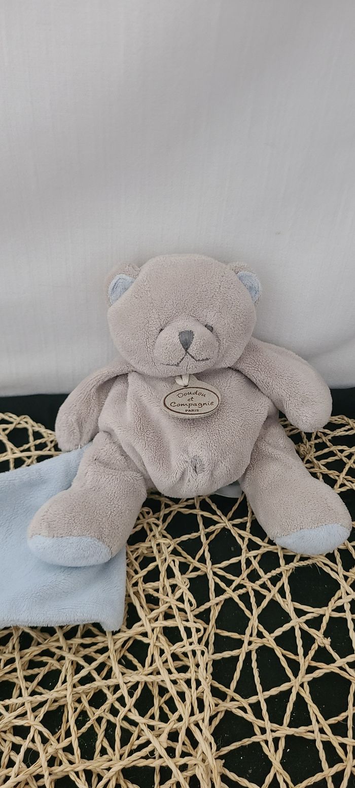 DOUDOU ET COMPAGNIE PELUCHE OURS GRIS BEIGE MOUCHOIR BLEU BILLES - photo numéro 1