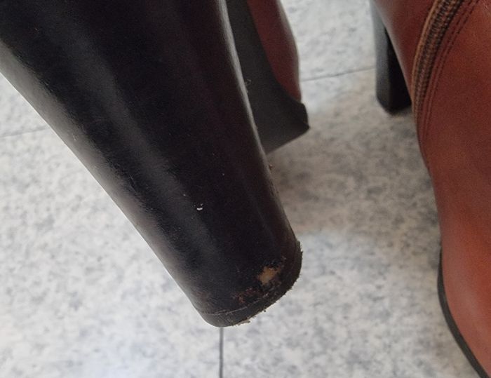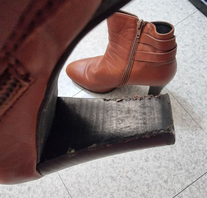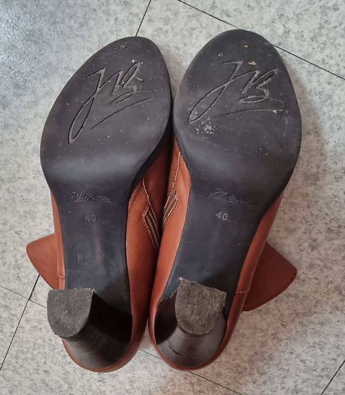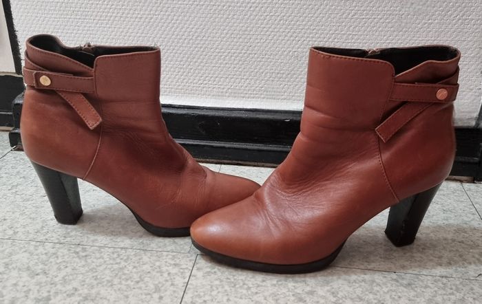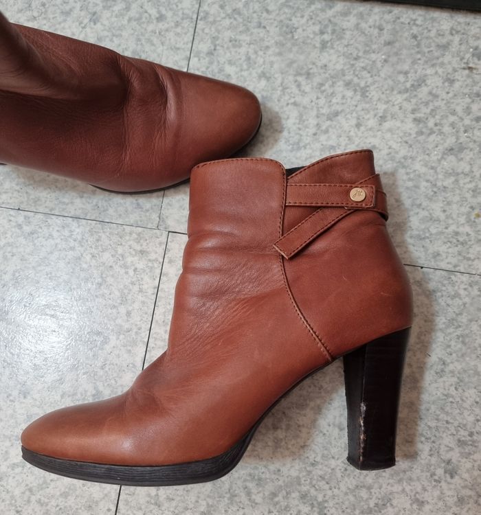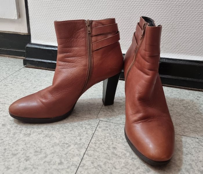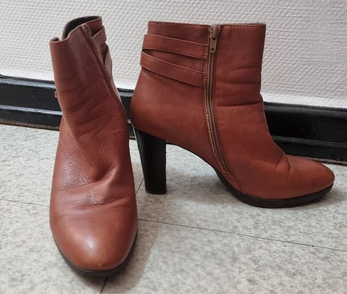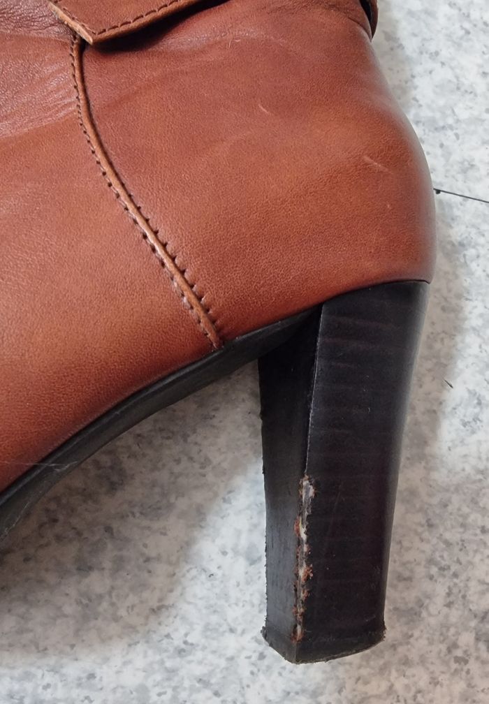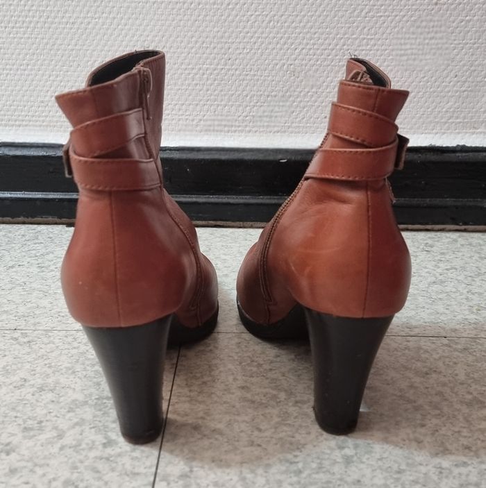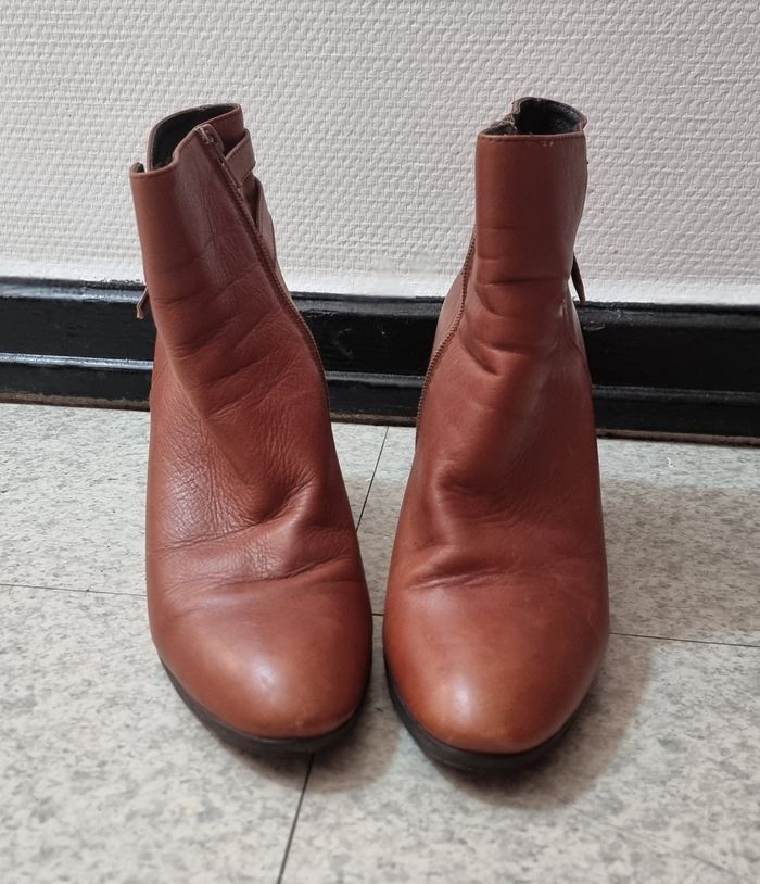 Je vends cette paire de bottines en cuir camel en bon état, avec quelques plis d'usage, semelles et talons légèrement usés (voir photos)