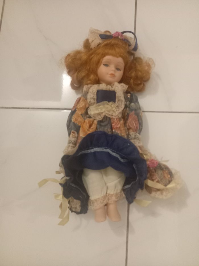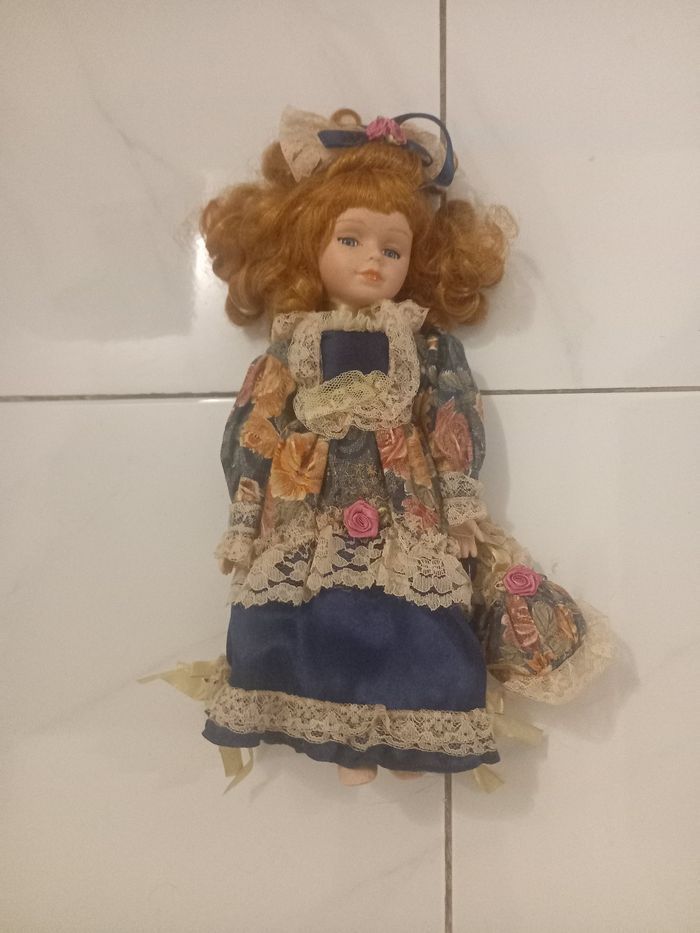 Poupee en porcelaine hauteur 32cm a fleurs couleur bleu,rose,blanc