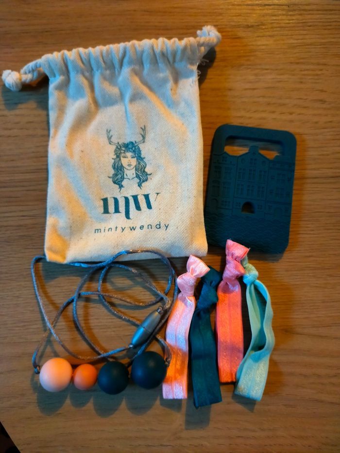Cadeau de naissance composé d'un collier, d'élastiques et d'un jouet de dentition. Le collier permet à bébé de s'accrocher ou s'occuper pendant la tétée ou le bibi. Les élastiques servent à s'attacher les cheveux pendant la tétée ou le bibi ou peut également se mettre au poignet pour se rappeler quel sein bébé à tété en dernier. Le jouet de dentition idéal pour soulager les maux de dent avec une bonne prise en main. Matière douce livré avec sa pochette de rangement.