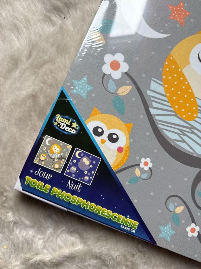 Tableau chouette (dans tous les sens du terme) 🖼️ Format carré – prêt à accrocher. 💡 Toile lumineuse – brille dans le noir (sans pile). 💡 Possibilité de faire un lot avec d'autres articles du dressing. Pour tous les articles DECORATION de la maison : #sabysabochedécoration __________________________________________________________ #décochambre #décoenfant #tableauchouette #phosphorescent #veilleusemurale #décomur