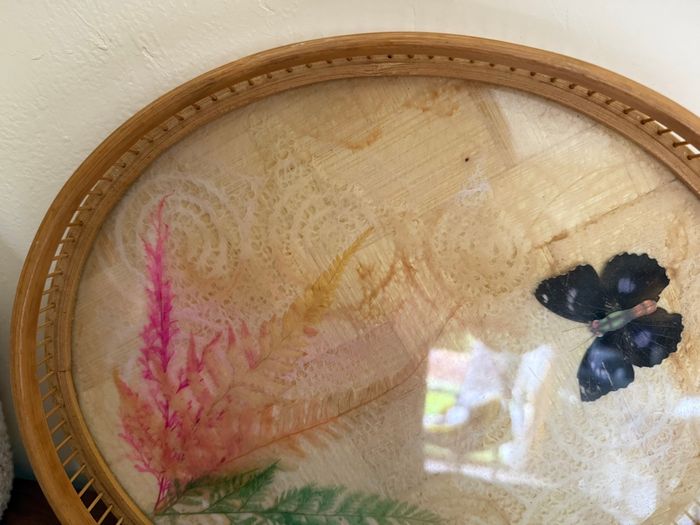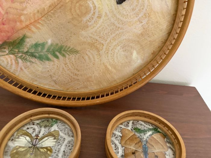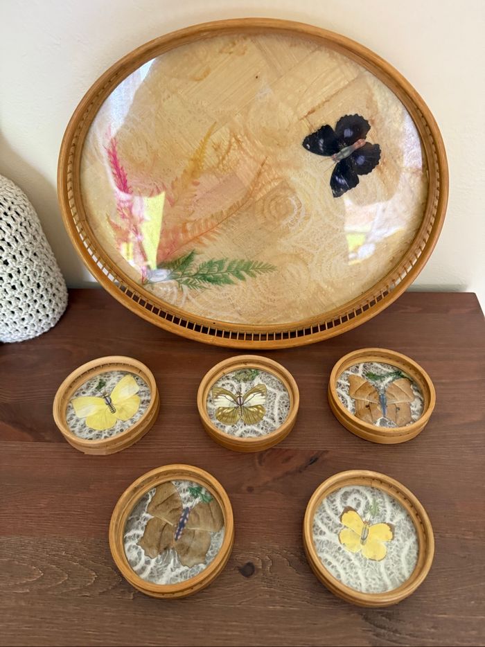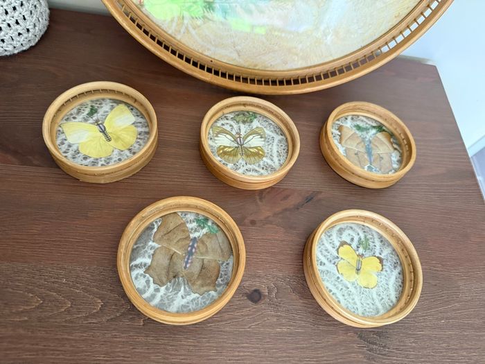 Plateau en bambou, bois et verre dont le fond en papier intissé blanc légèrement abîmé. 5 sous verres motifs papillons Vintage années 70 Diamètre du plateau 28,5 cm Diamètre des sous verres 8,5 cm
