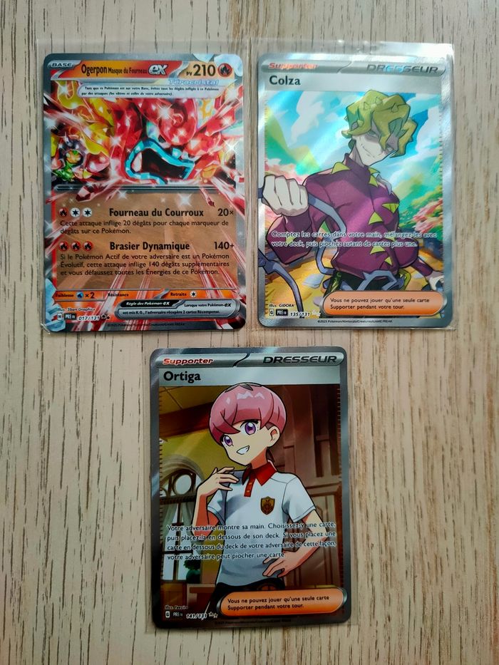 Bonjour, je vends différentes cartes Pokémon de l'extension Évolutions Prismatiques. Les cartes sont toutes officielles.  Prix du lot : 10€ Possible de prendre à l'unité:  3,5€/carte Cartes restantes : 017/131 Ogerpon Masque du Fourneau EX 135/131 Colza 141/131 Ortiga Plus de photos possibles sur demande  Livraison possible via le relais de votre choix N'hésitez pas à regarder mes autres annonces ;)