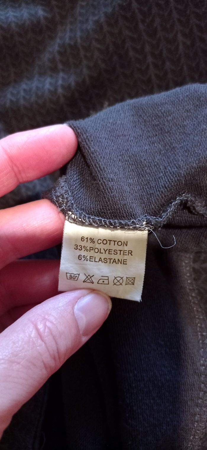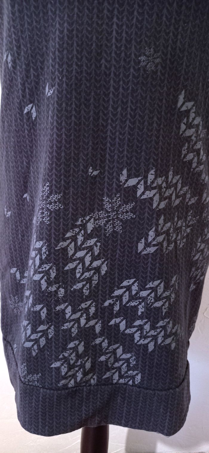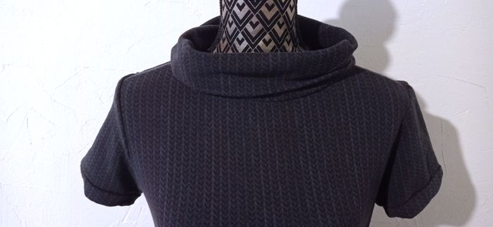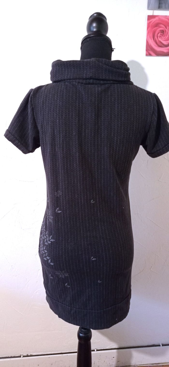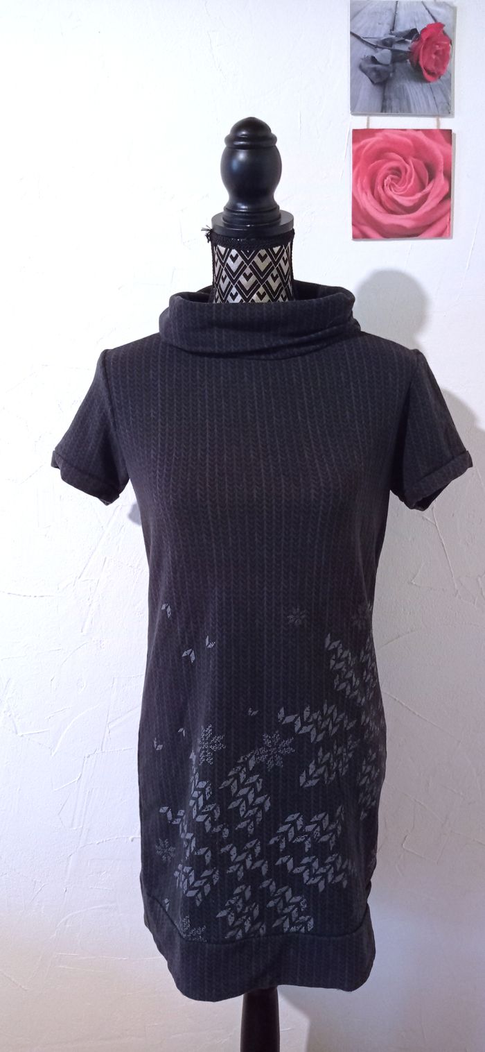 Jolie robe à manches courtes avec un petit col roulé. Gris foncé avec déco gris clair. Très bon état Largeur à plat d'une aisselle à l'autre : 45cm, à la taille : 42cm, longueur depuis le dessus de l'épaule : 77,5cm environ. #frip_femme38
