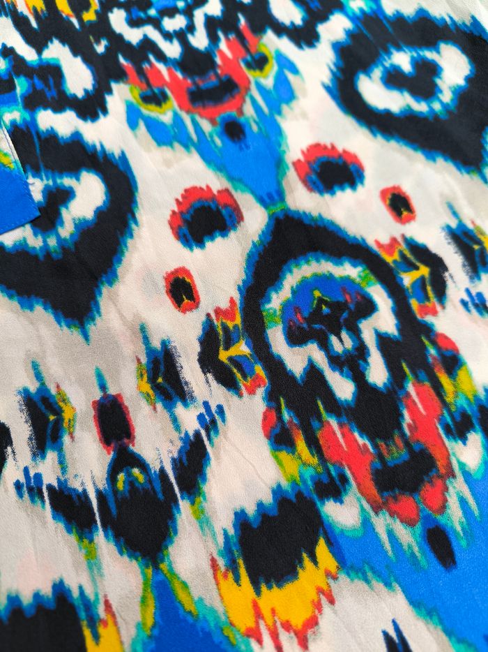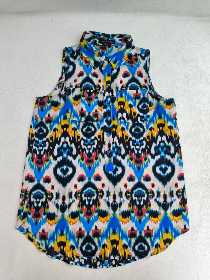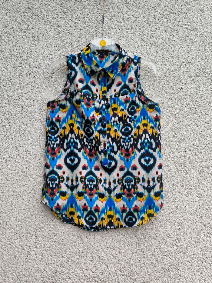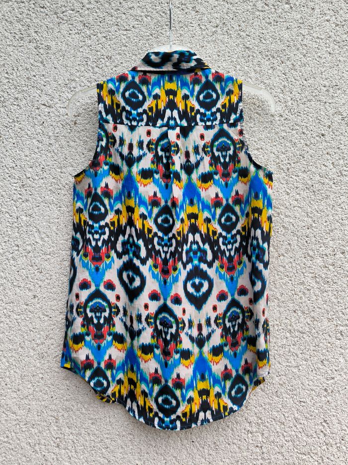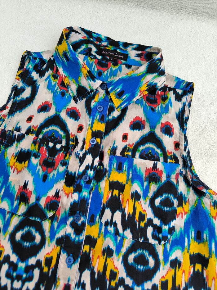 Blouse longue sans manches Marque Violet & Claire Taille S, 36 • Coloris blanc, bleu, noir, jaune, rouge, vert... • Imprimés • Boutons à l'avant • 2 poches • Tissu fin, fluide Largeur aisselle à aisselle non étirée : 45 cm Largeur aisselle à aisselle étirée au maximum : 50 cm Longueur totale : 68 cm Longueur aisselle : 40 cm En très bon état #evelyne_taille_36