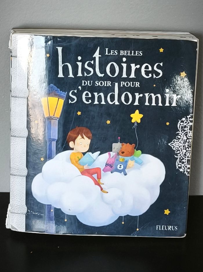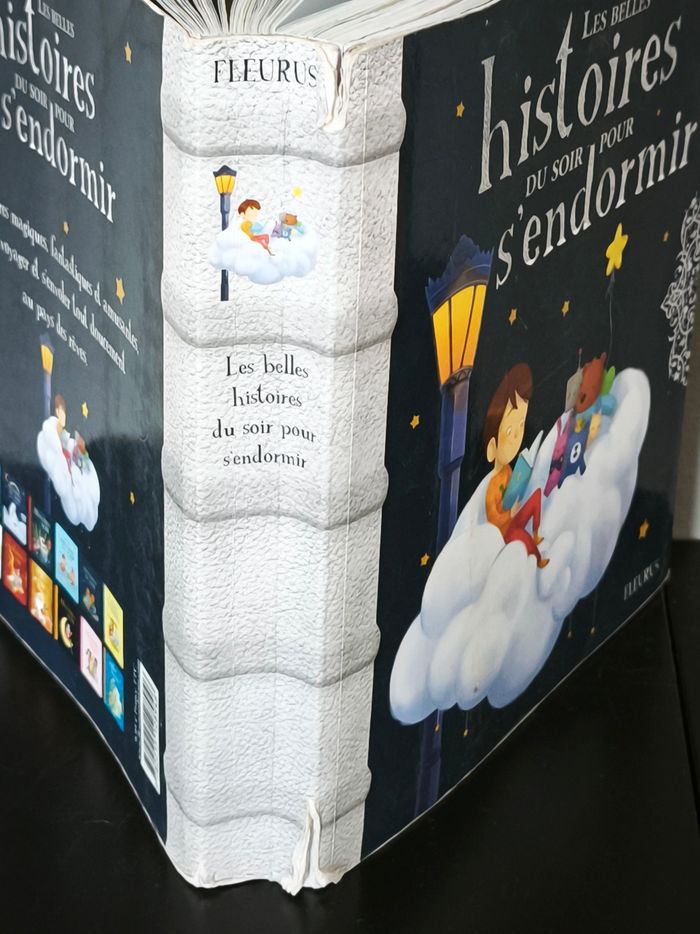 Livre " les belles histoires du soir pour s'endormir" Le livre a bien servi et la couverture est abîmée mais il peut encore servir, les pages n'ont rien