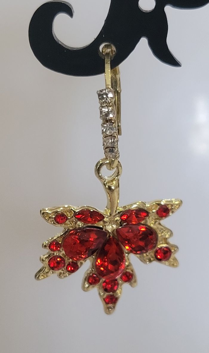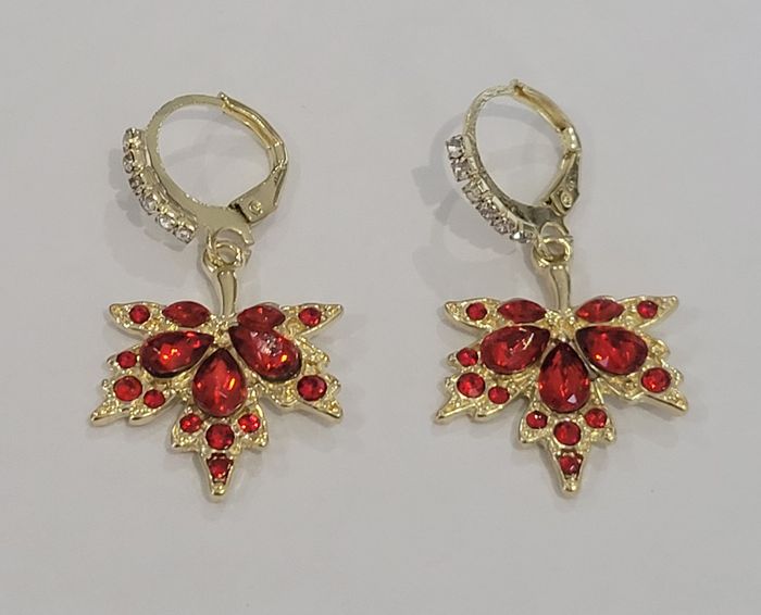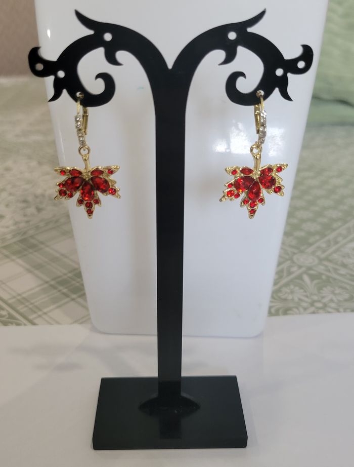 BOUCLES D'OREILLES ANNEAUX FEUILLE D'ERABLE ! NEUF ! 1 jolie paire de boucles d'oreilles en forme de feuille d'erable Anneaux coloris doré, feuille dorée strass rouge. Dimensions : 3,6 x 1,8 cms. Diametre de l'anneau (sertit de strass) : 1,4 cms N'hésitez pas à regarder mes autres ventes. Produit sous blister ! Envoi rapide et soigné.