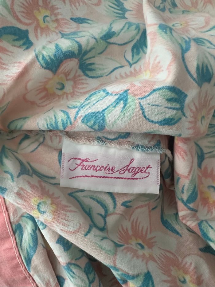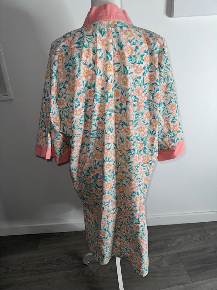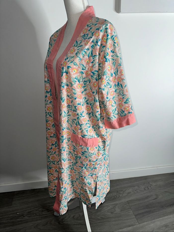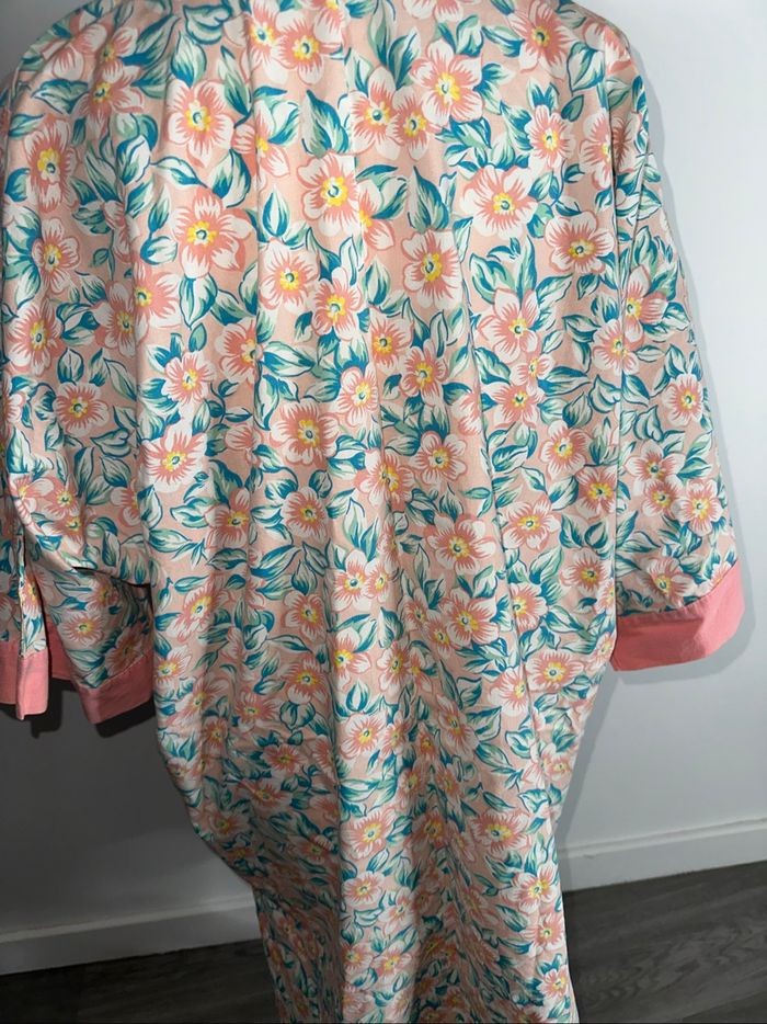 Peignoir kimono - Excellent état - Taille 38/40 équivalent M/L Dimensions en bas de l’annonce - Vintage, années 80’ - Françoise Saget - Imprimés fleurs - Rose corail, vert et blanc - Deux poches - Ne se ferme pas - 100% coton Dimensions: - 75cm niveau aisselles - 104cm de long