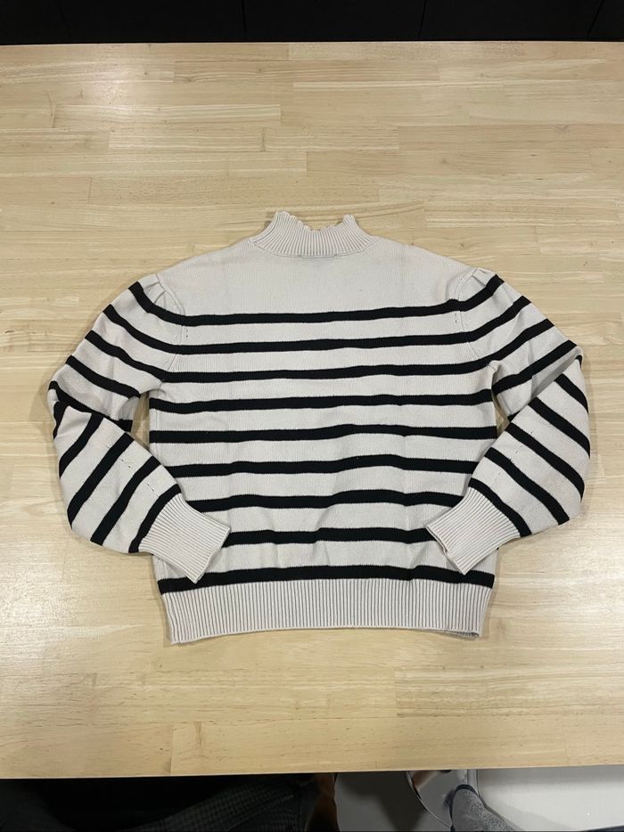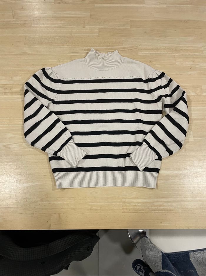 Vends pull couleur crème rayé noir, taille XS (taille plutôt comme une taille S), de marque Morgan, en très bon état.