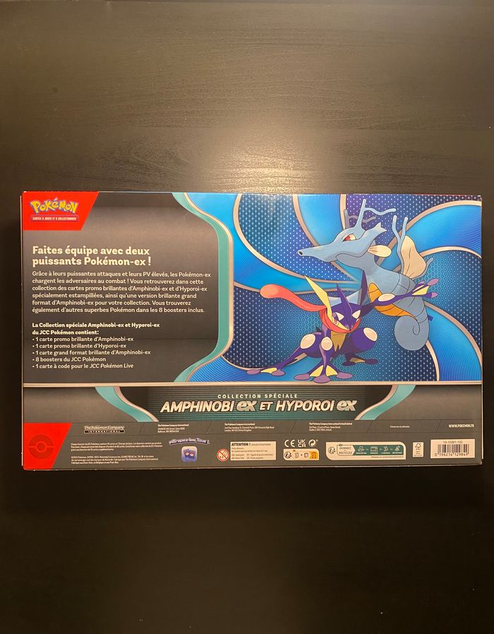 Coffret Pokémon Amphinobi ex & Hyporoi ex – Collection Spéciale Noël Smyths Toys – Neuf – VF Produit neuf sous blister, version française, exclusivité Smyths Toys (Collection Spéciale Noël). Ce coffret contient : 2 cartes promo exclusives (Amphinobi EX & Hyporoi EX) 1 carte jumbo Amphinobi EX 8 boosters Pokémon (4 ev04, 2 ev01, 2 ev10) Envoi rapide et protégé avec soin. Remise en main propre possible sur Bordeaux et alentours. N’hésitez pas à me contacter pour plus d’informations ou photos ! 🌷
