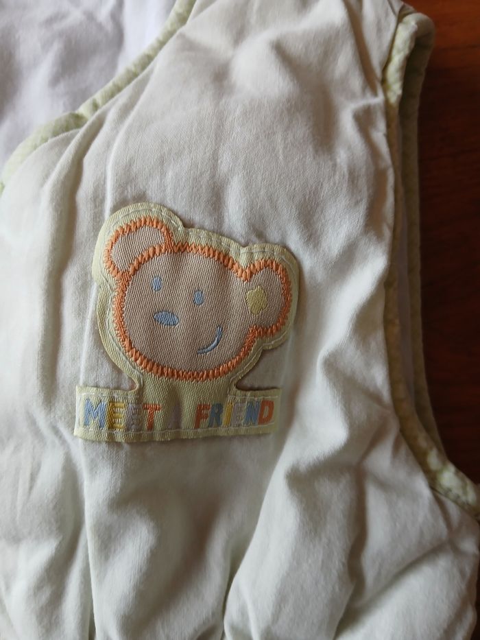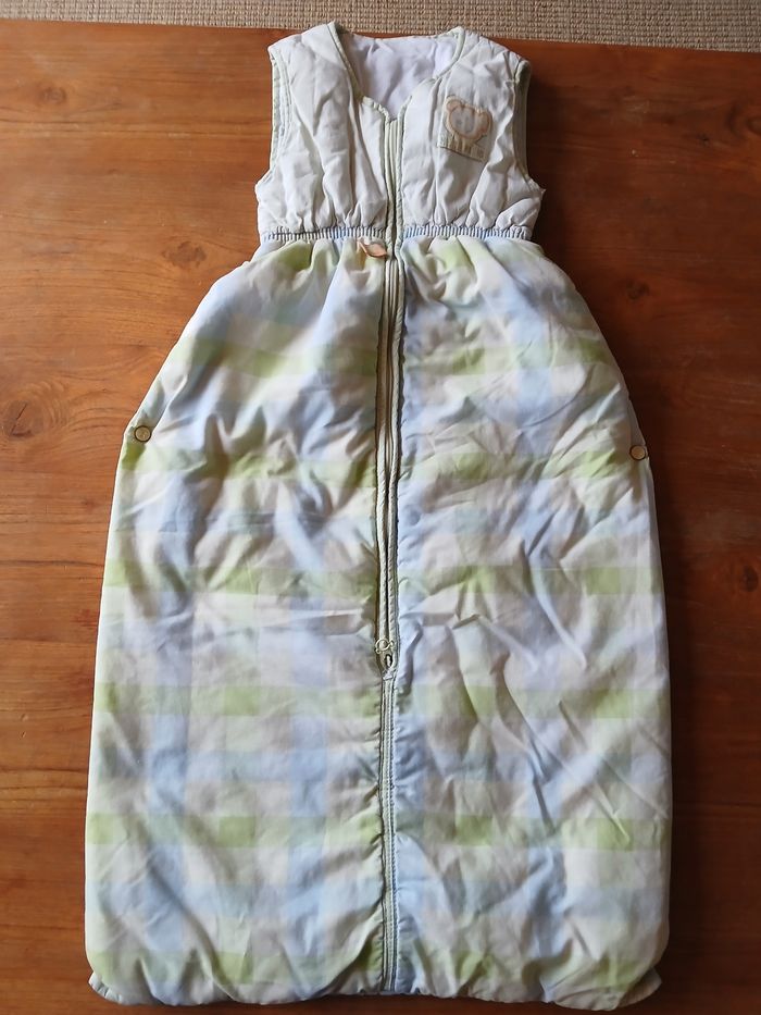 Gigoteuse molletonnée a carreaux verts, bleus et blancs. Peut être réduite grâce à deux boutons pressions dans le dos Longueur totale : environ 91 cm Très bon état