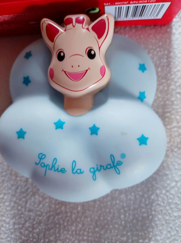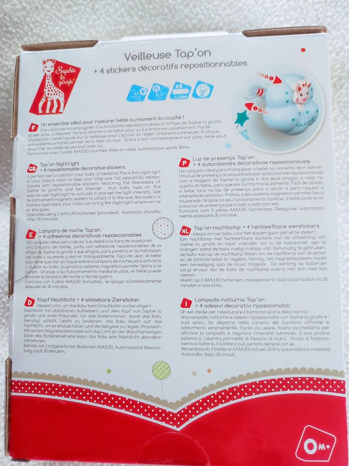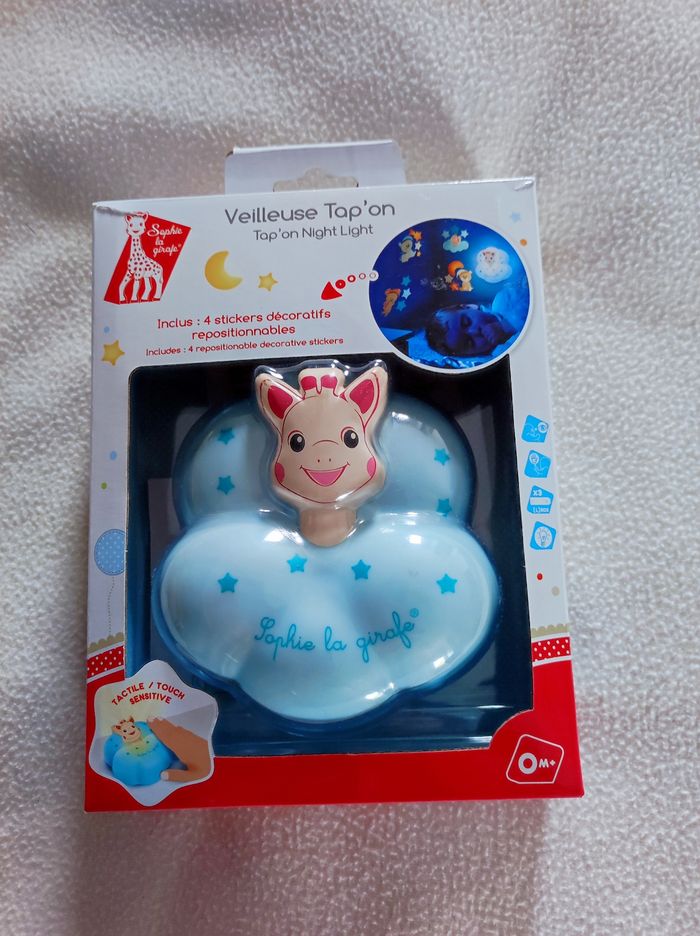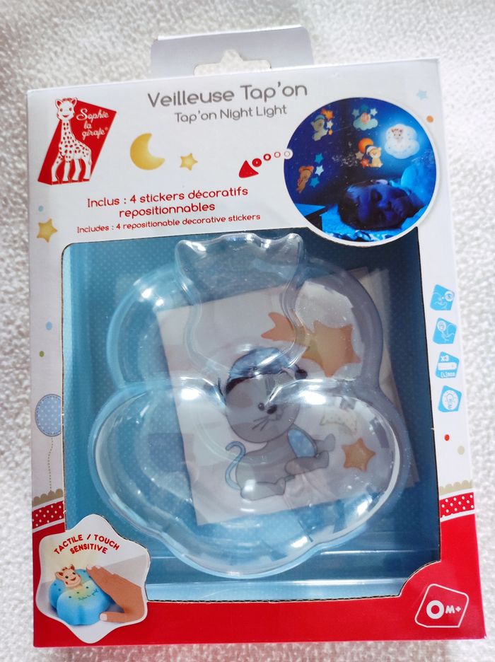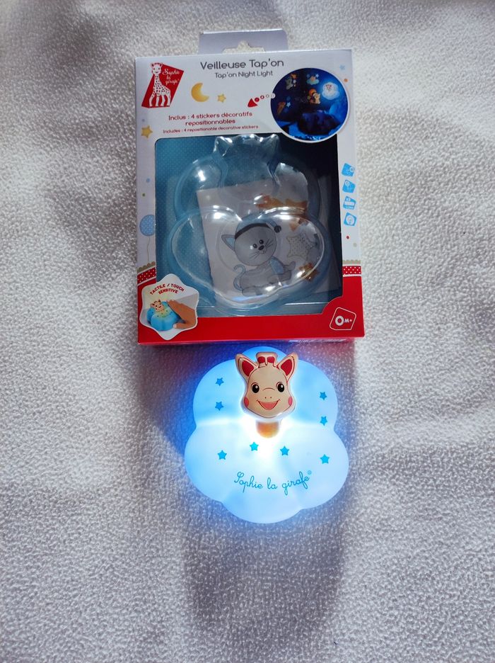 Veilleuse qui fonctionne, j'ai encore la boîte, juste une petite tâche que je n'ai pas réussi à enlever et quelques mini rayures qui sont peu visibles et que je n'arrive pas à prendre en photo. Nous n'avons pas utilisé les stickers. Il faudra changer la pile.