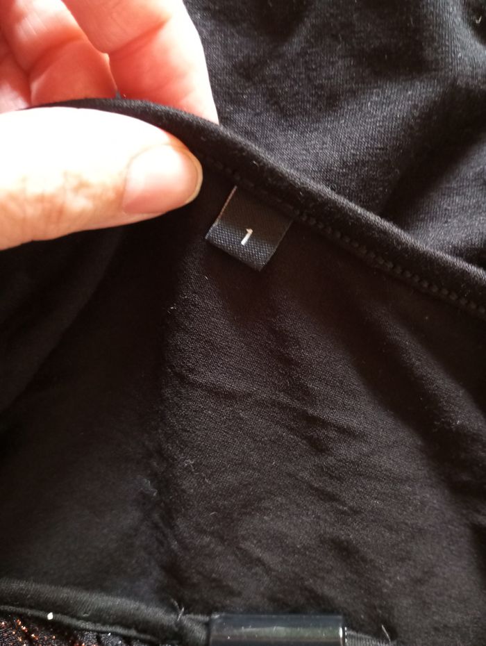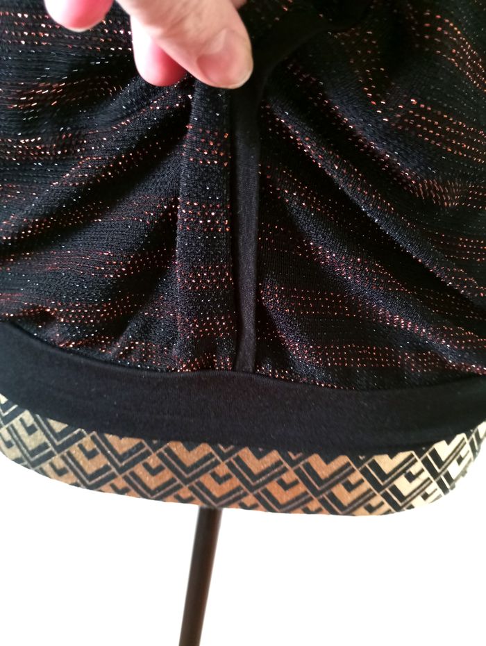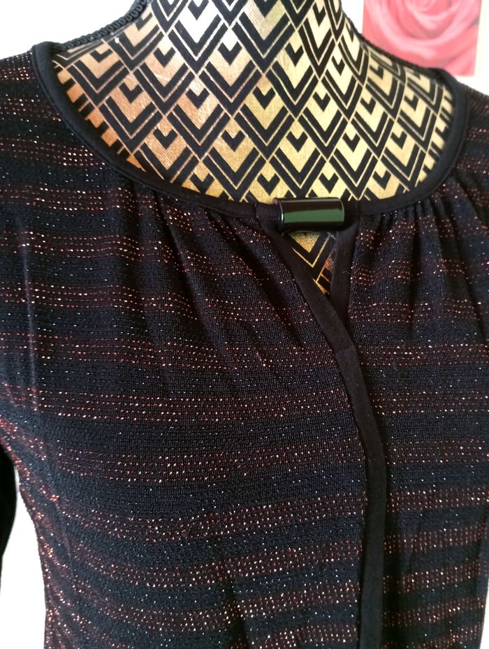 Jolie blouse noire avec sur le devant des rayures cuivrées, décolleté original, base resserrée, dos et manches (qui s'arrêtent au niveau du coude ) unis noir. Très bon état. Largeur à plat d'une aisselle à l'autre : 48cm, longueur à partir du dessus de l'épaule : 58cm environ, longueur des manches depuis la couture sur l'épaule : 38cm. #frip_femme36