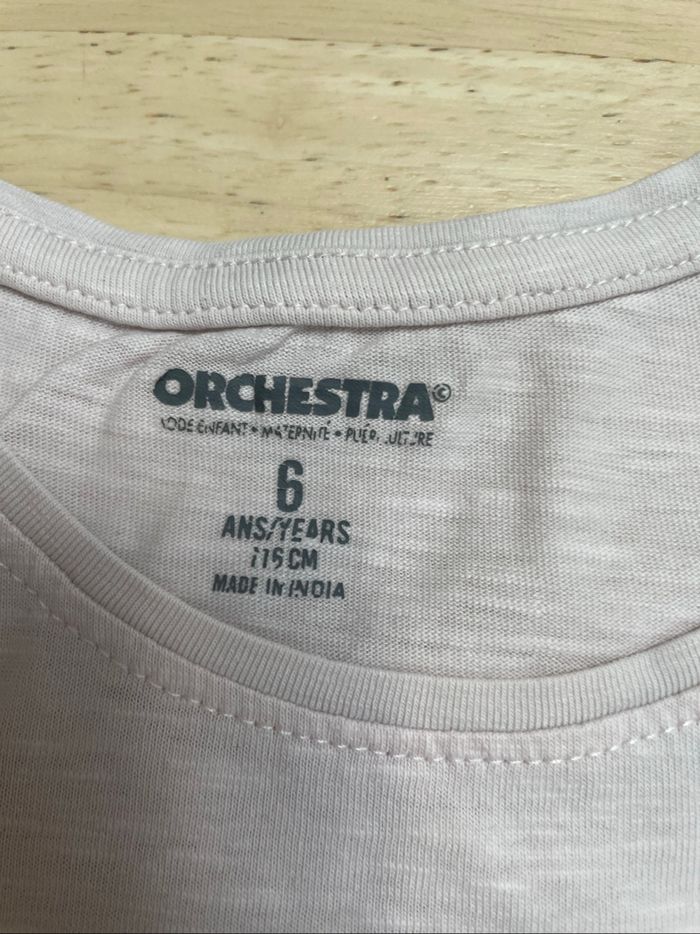 Vends tee-shirt couleur rose pâle, taille 6 ans, de marque Orchestra, en très bon état.