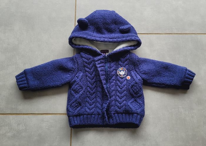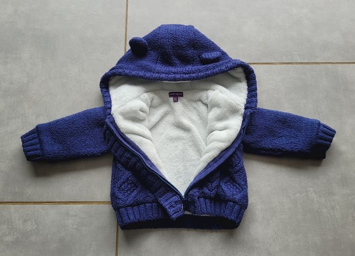 Gilet très chaud, à capuche, en pilou à l'intérieur et en effet laine à l'extérieur, de couleur marine avec petit macaron sur le cœur, de la marque Sergent Major, taille 6 mois (68 mois), en très bon état. Article lavé pour la vente.