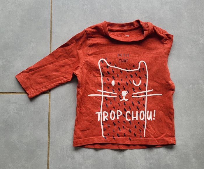 T-shirt manches longues, de couleur brique, avec motifs, de la marque Gémo, taille 9 mois, en très bon état. Article lavé pour la vente.