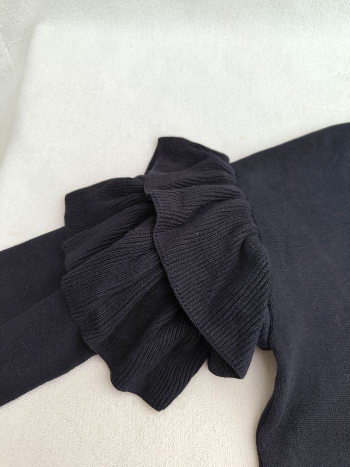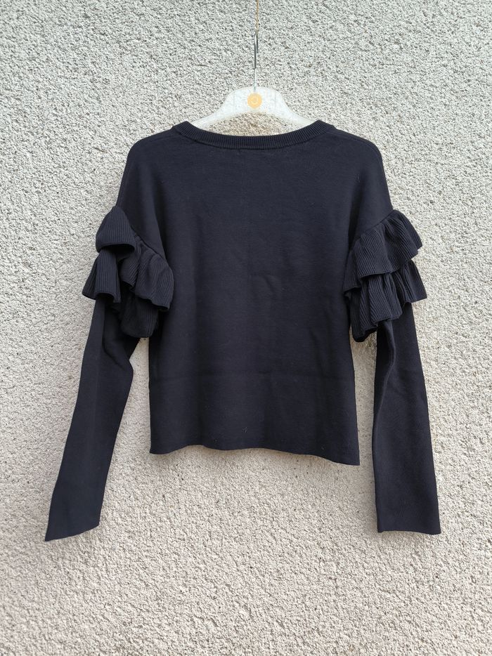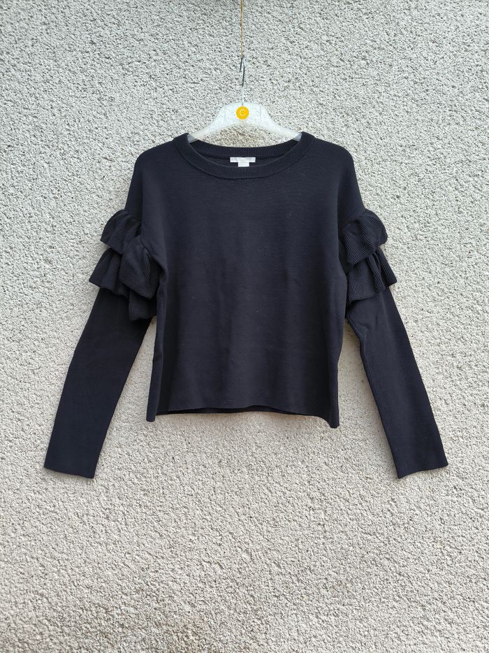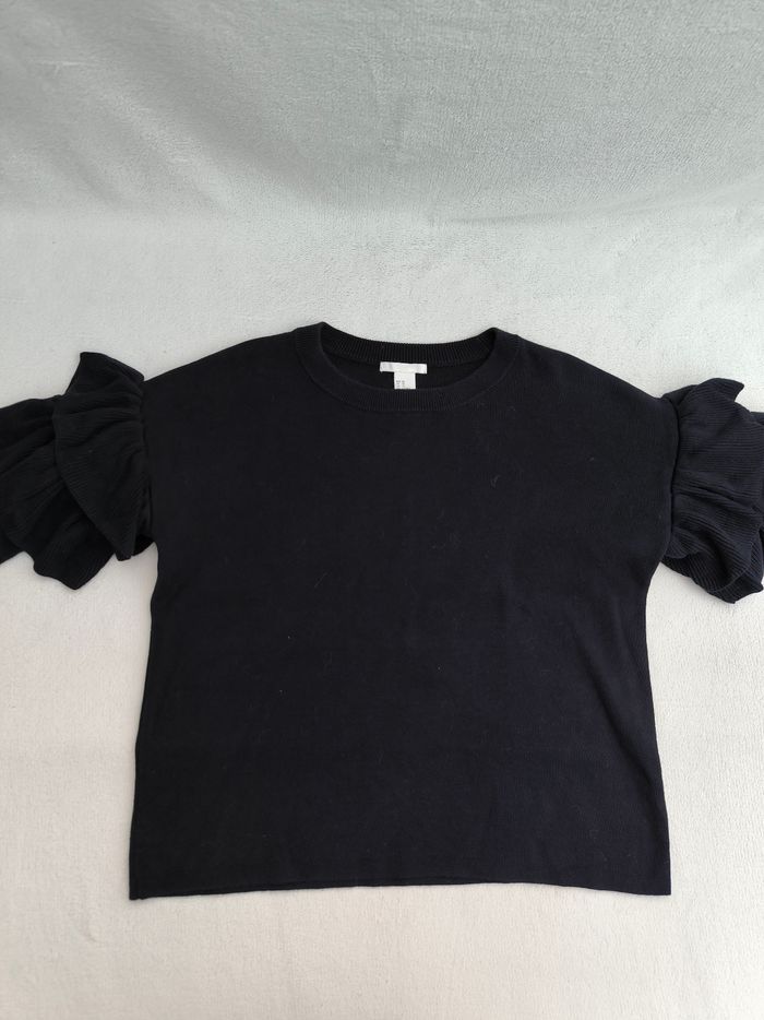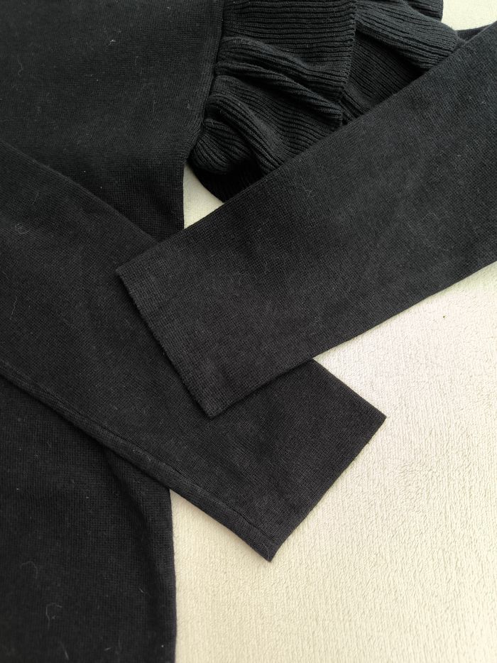 Pull à manches longues Marque H&M Taille XS, 34, taille grand • Coloris noir • Col rond • Manches volantées • Stretch • Coton fin Largeur aisselle à aisselle non étirée : 50 cm Largeur aisselle à aisselle étirée au maximum : 74 cm Longueur totale : 53 cm Longueur aisselle : 35 cm Comme neuf #evelyne_taille_34