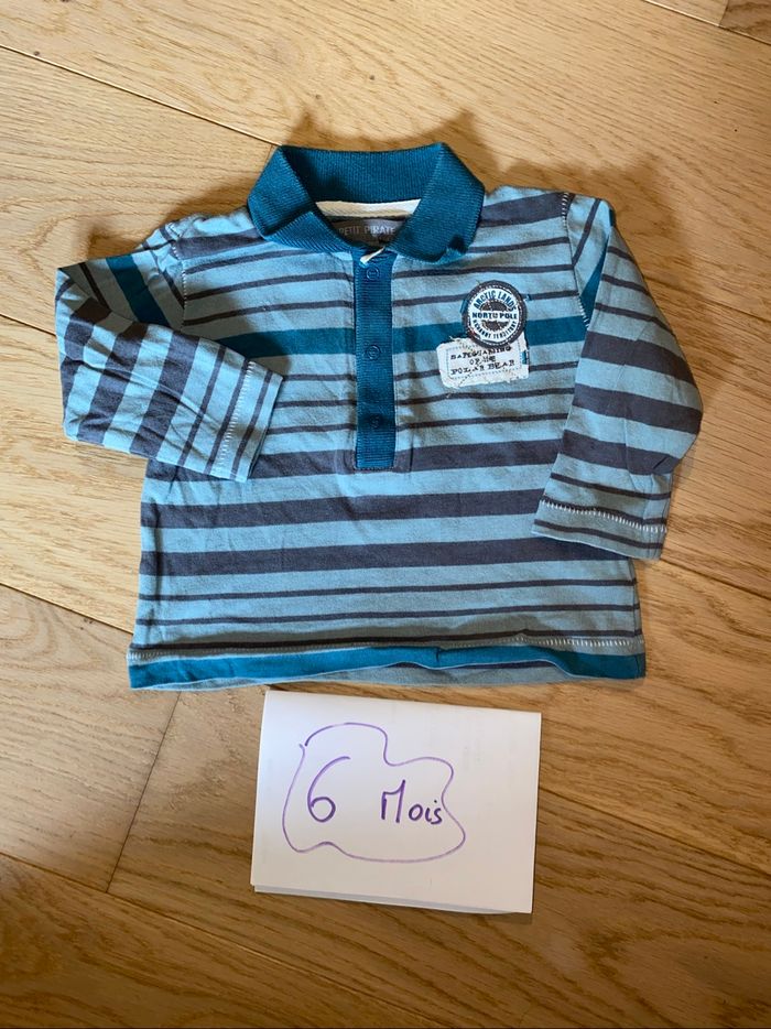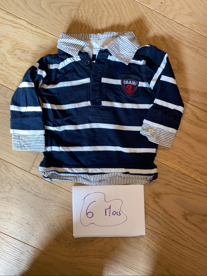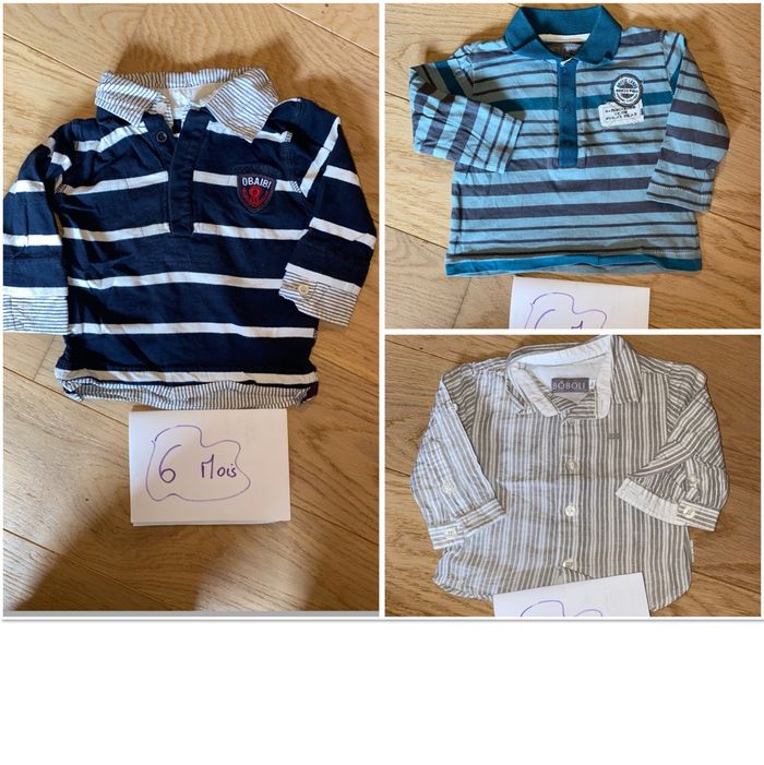 Lot chemises / polos – 6 mois 🧵 Lot de chemises et polos habillés et confortables 👕 Chemise Boboli crème à rayures 👕 Polo Obaïbi marinière avec joli col 👕 Polo bleu canard « petit pirate » en parfait état 📍 État : Très bon état 💬 Lot idéal pour des looks un peu plus habillés tout en restant confortables ✨ 🎁 Réductions automatiques sur les lots activées 🏷️ @6mois_nasta37