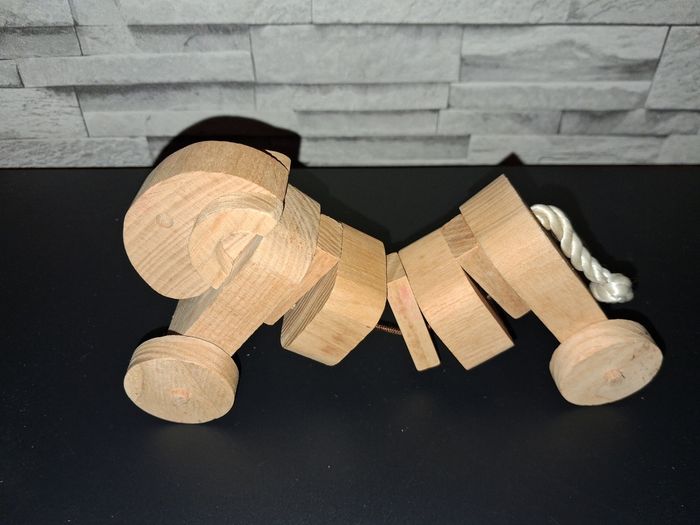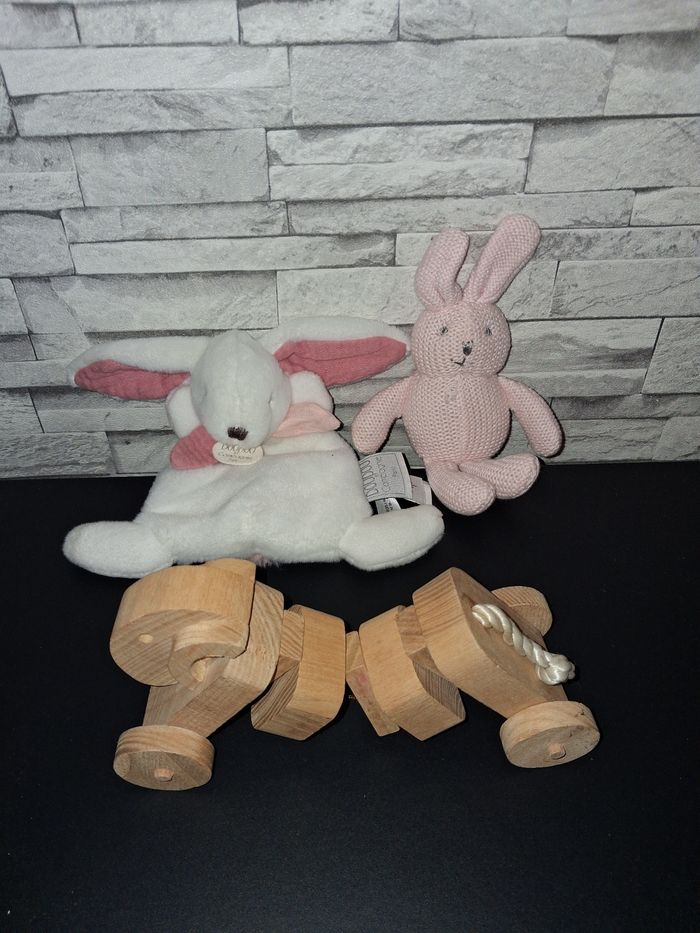 Un jouet en bois et deux doudous