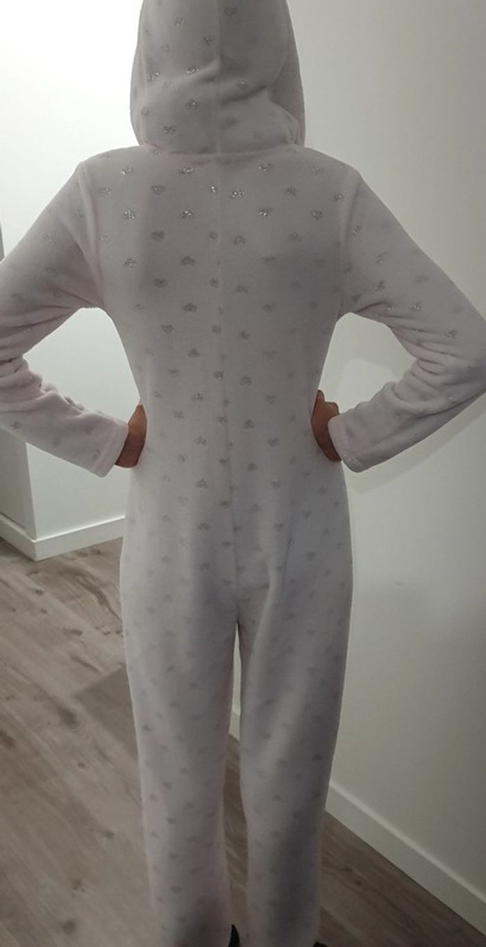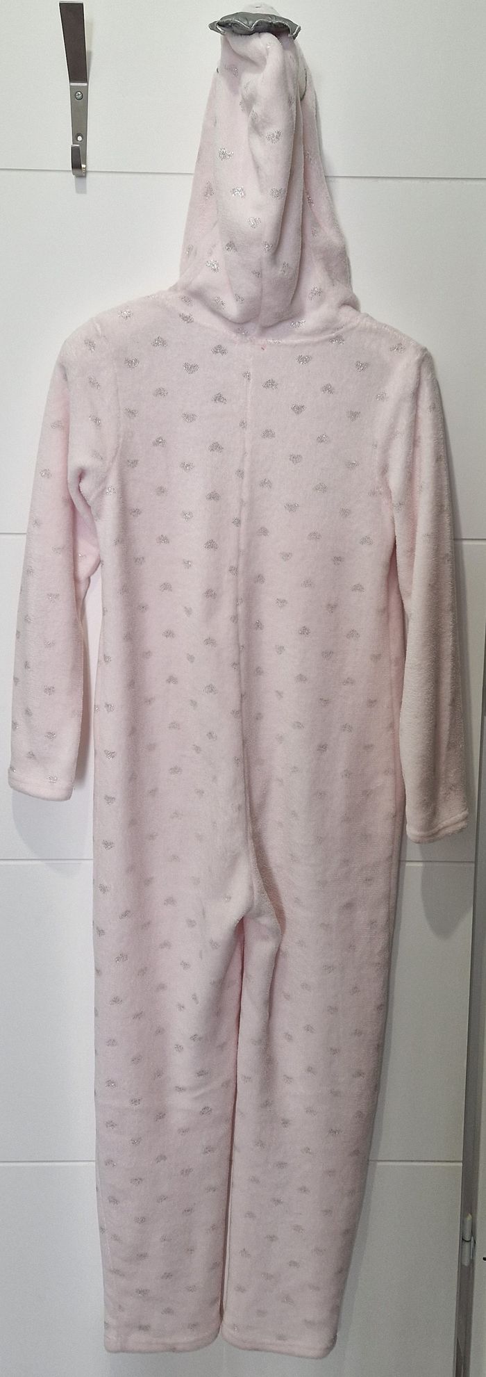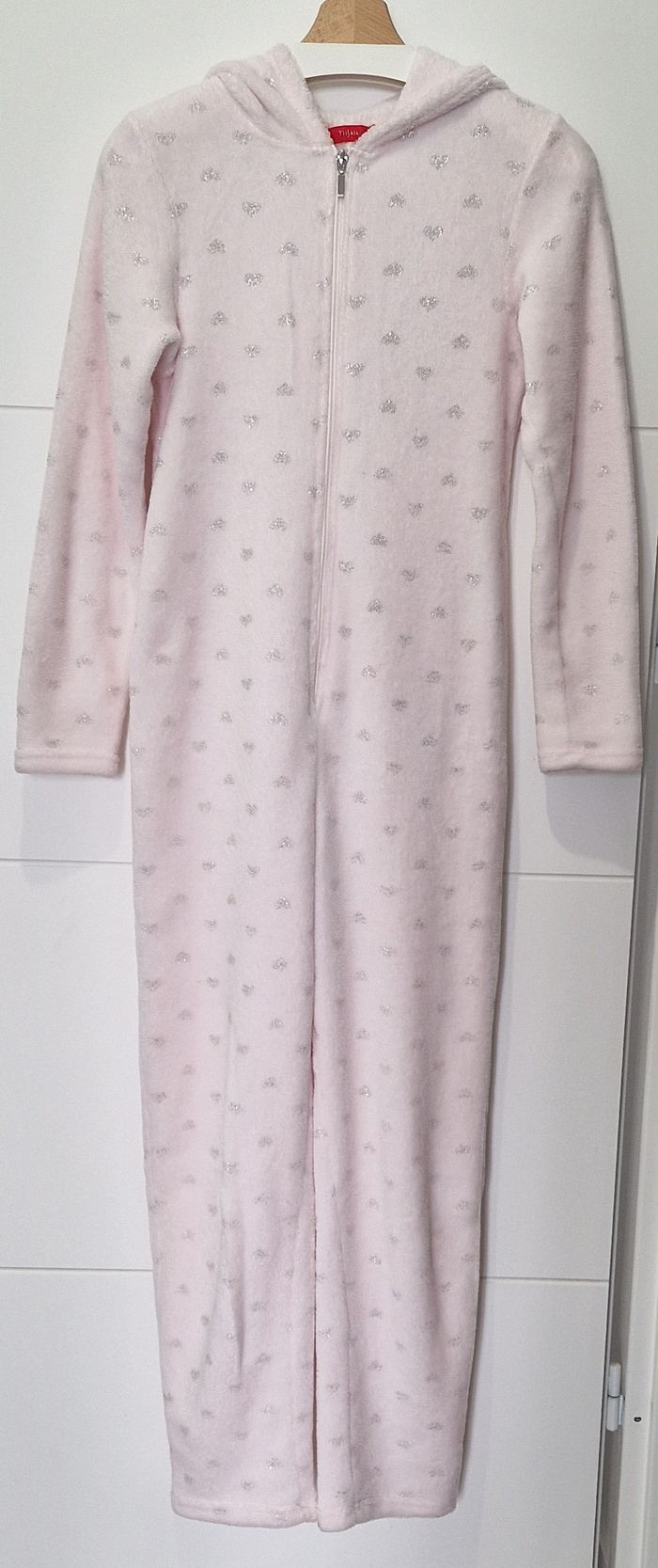 Pyjama / Surpyjama rose à cœurs pailletés et à capuche de la marque Tissaia, taille 34/36. Tout doux. Capuche surmontée d'une petite couronne et d'un motif brodé, Fermeture Eclair sur toute la longueur à l'avant. TBE général, rien de particulier à signaler.