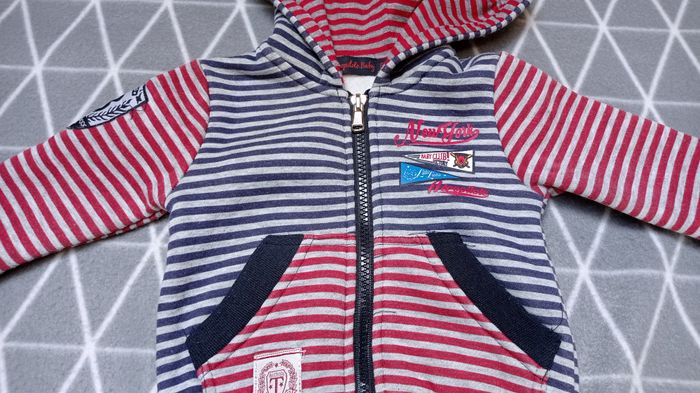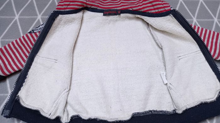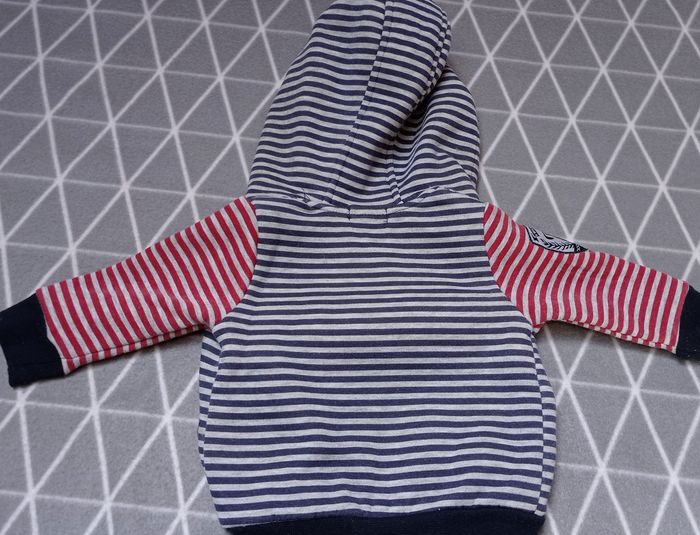 jolie veste zippée (façon sweat-shirt) gris avec des rayures rouges et bleues marines. LégÚrement fourrée à l'intérieur. TrÚs bon état général. #frip_bébégarçonSixMois