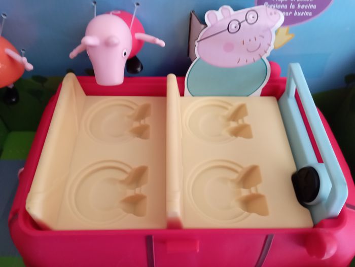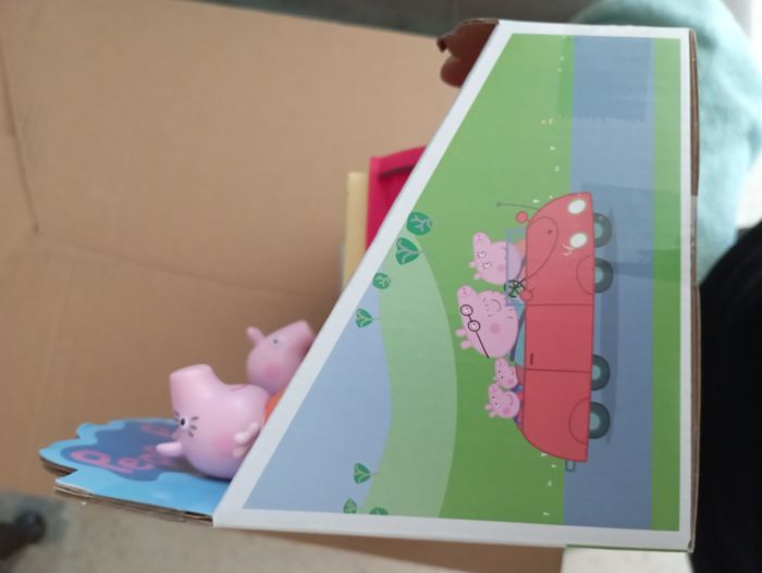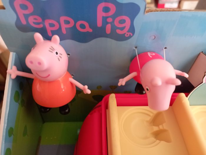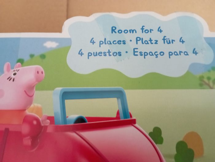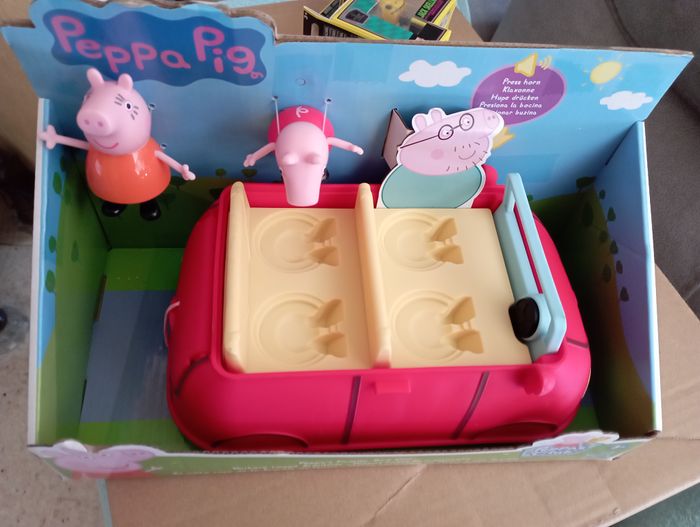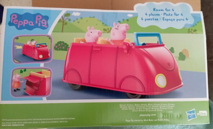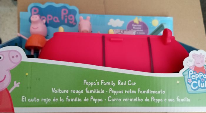 La famille Pig aime voyager ensemble et quand elle le fait, c'est souvent dans sa voiture rouge. La Voiture rouge familiale est inspirée de la voiture du dessin animé célèbre, et est vendue avec les figurines Maman Pig et Peppa qui prennent place à bord. Les enfants imagineront qu'ils vont acheter des biscuits pour Papa Pig et le petit George ! Ce véhicule roule vraiment quand on le pousse, et son coffre s'ouvre et se referme. Quand les enfants appuient sur le volant, ils entendent la musique du dessin animé, des bruits de klaxon, des rires et autres. On ne s'ennuie jamais en voiture avec la famille Pig !