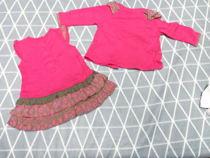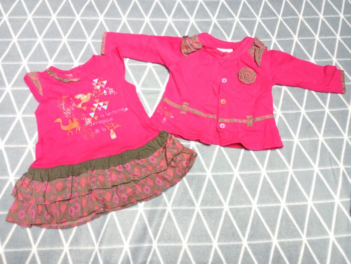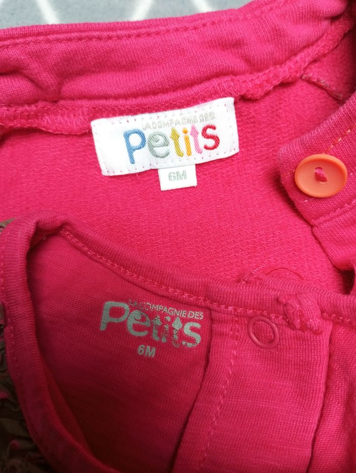 🦄1 joli petit ensemble fuchsia et kaki en couleurs principales, composé d'une robe à volants avec de toutes petites manches, boutonnée en haut du dos et d'un gilet assorti. Très bon état. La compagnie des petits 🦄1 t-shirt manches longues gris clair avec chaussons de dans en déco, boutonné en haut du dos. Très bon état. Mes petits cailloux 🦄1 t-shirt manches longues rose clair avec déco étoiles, boutonné sur l'épaule. Très bon état, in extenso. 🦄1 body manches courtes fuchsia, très bon état général, juste petit fil décoratif décousu sur le bas. #frip_bébéfilleSixMois