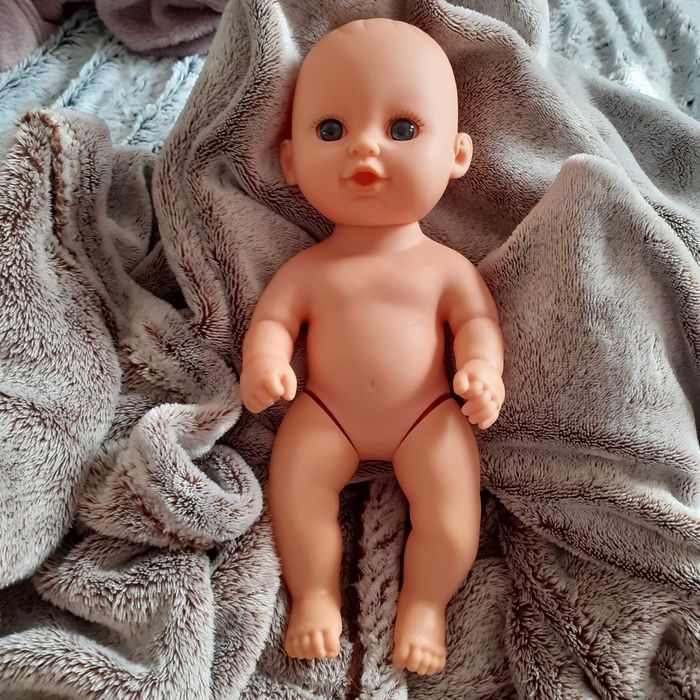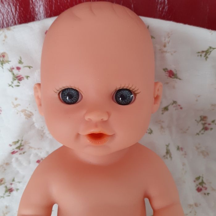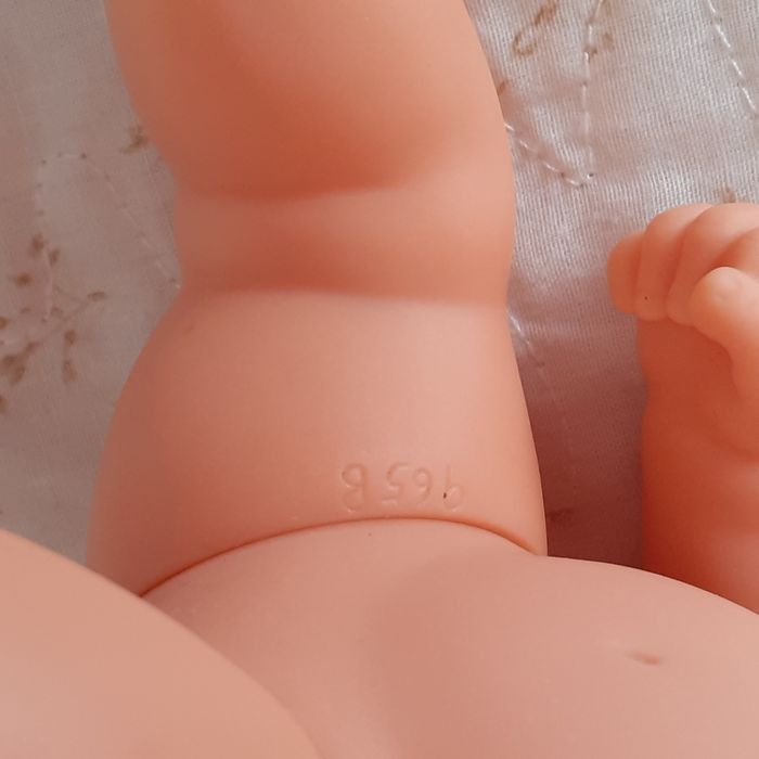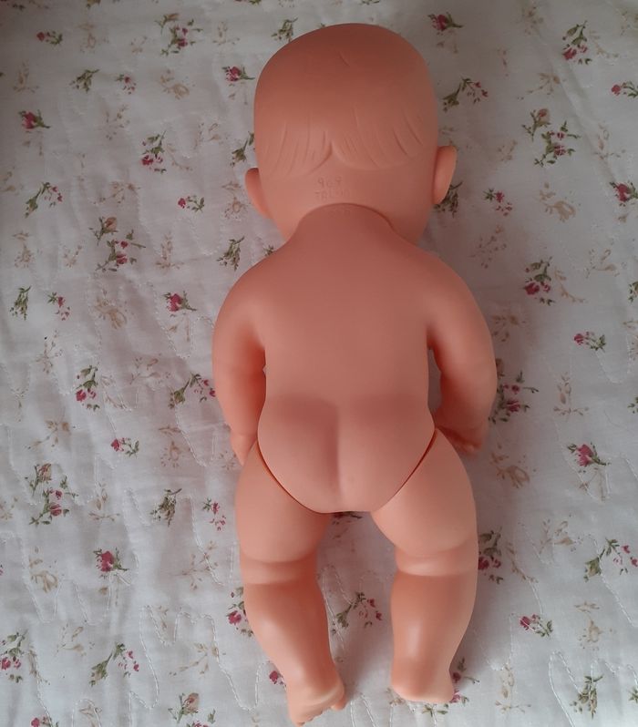 Poupon en plastique; yeux en plastique et cils peints; articulé aux niveaux tête et jambes ( pas d'articulation au niveau des bras ) Numéroté sur la nuque et sur chaque cuisse. Hauteur totale de 25 cm. Vendu tel quel, SANS vêtements. Noté en bon état car traces indélébiles d'origine sur les fasses ( voir dernière photo) et qq marques sur le corps. Bien tenir compte de ce paramètre // voir photos pour détails