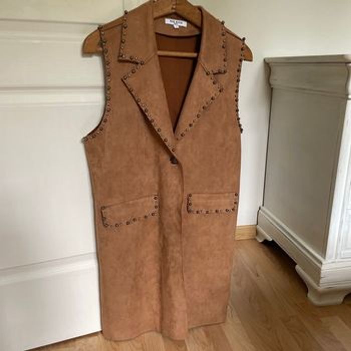 Veste en suédine camel sans manches, à mettre avec un pull col roulé ou chemisier manches longues et un jeans. Neuf , porté une fois.