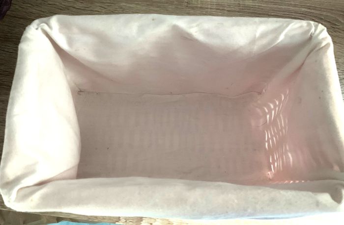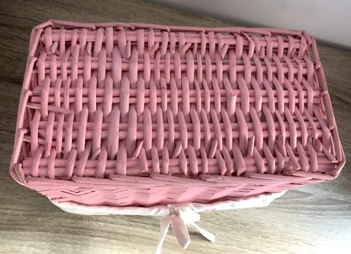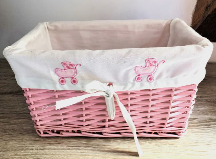 Grande corbeille rectangulaire en osier rose et toile brodée