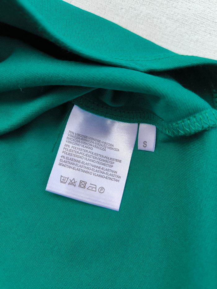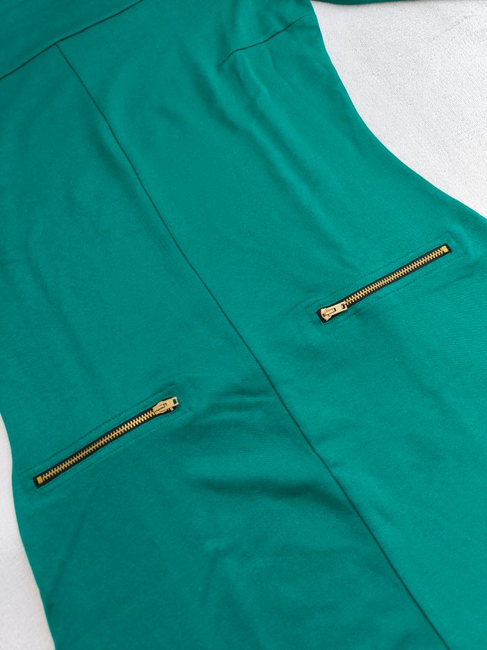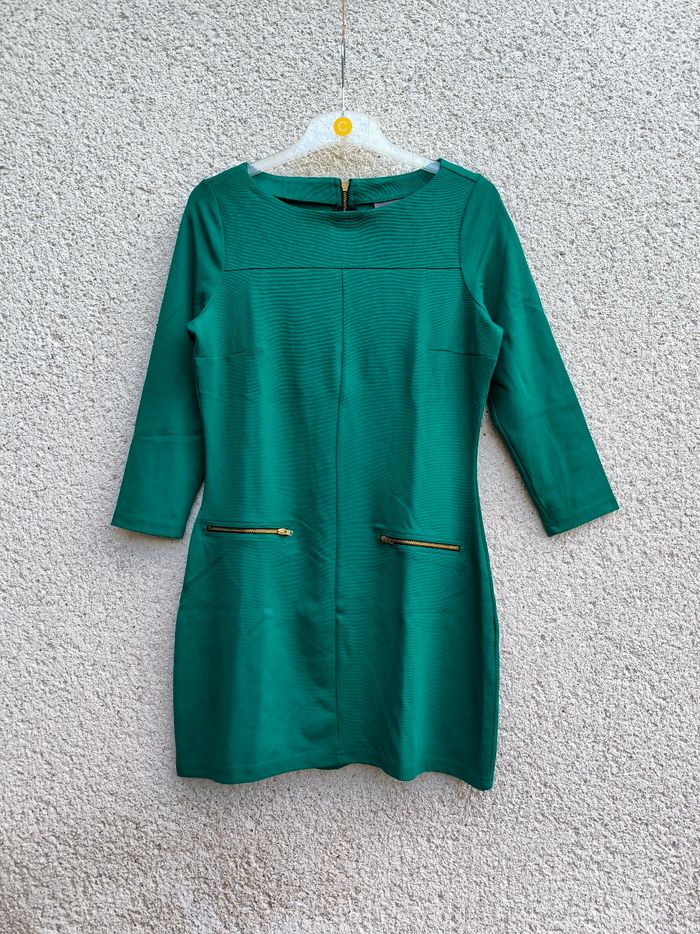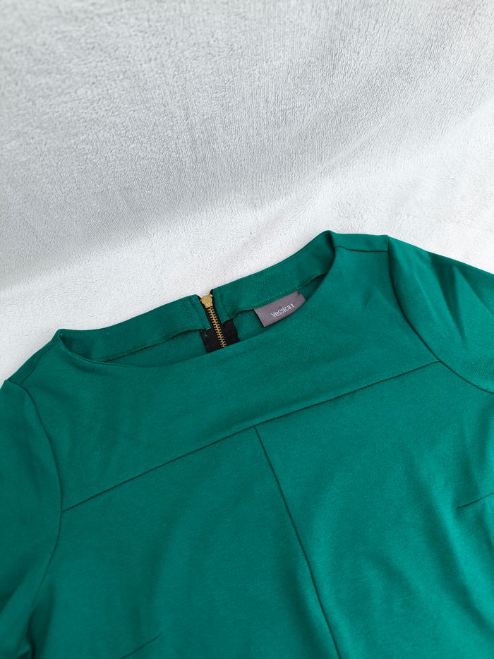 Robe à manches 3/4 Marque Yessica Taille S, 36 • Coloris vert • Fermeture éclair au dos • Fausses poches • Tissu fin, stretch • Tache sur le bas Largeur épaule à épaule non étirée : 36 cm Largeur épaule à épaule étirée au maximum : 47 cm Largeur aisselle à aisselle non étirée : 44 cm Largeur aisselle à aisselle étirée au maximum : 64 cm Longueur manche : 49 cm Longueur totale : 83 cm Longueur aisselle : 62 cm Peu portée, en très bon état #evelyne_taille_36