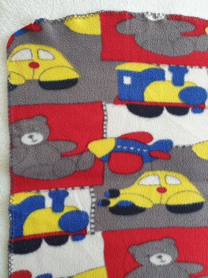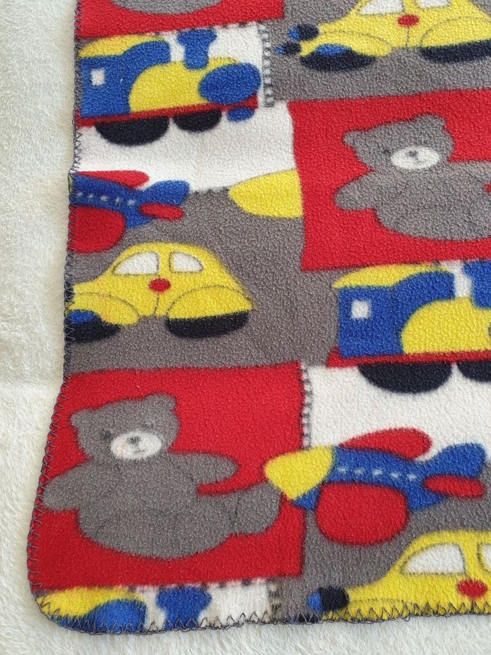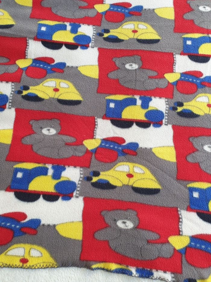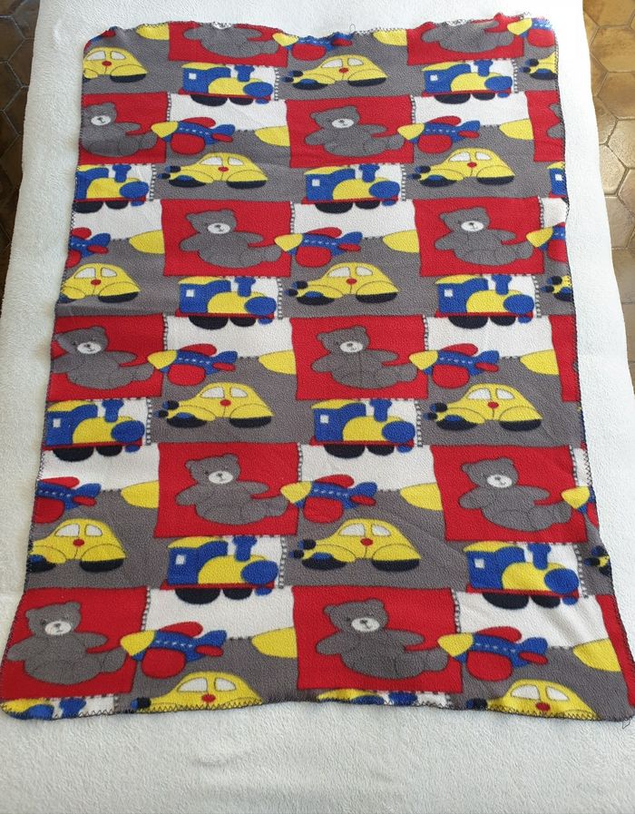Petit plaid décoré voiture, ourson, train, avion. Il mesure environ 1,10mx1,40m. Ile a des défauts dus à son utilisation. (Voir photos).
