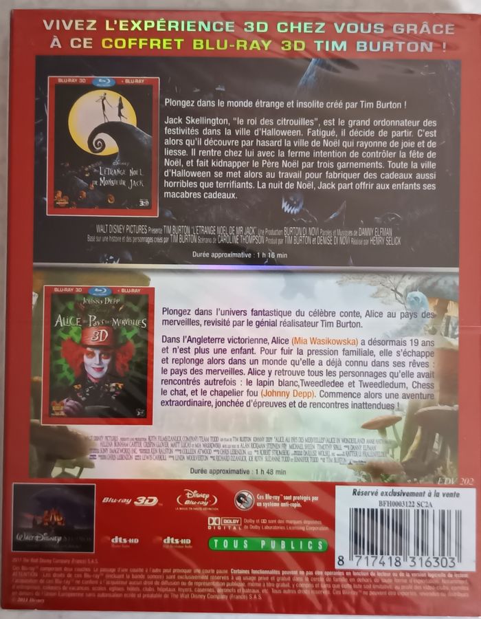Coffret Tim Burton 2 Films dvd Blu-ray 3D + Blu-ray Neuf Scellé Comprenant: L'étrange Noël de Monsieur Jack Alice au pays des merveilles