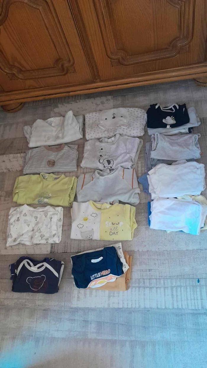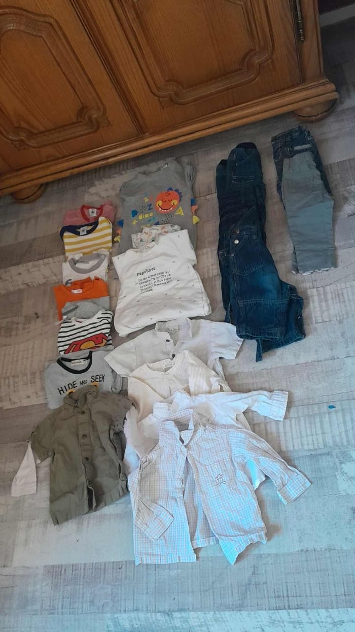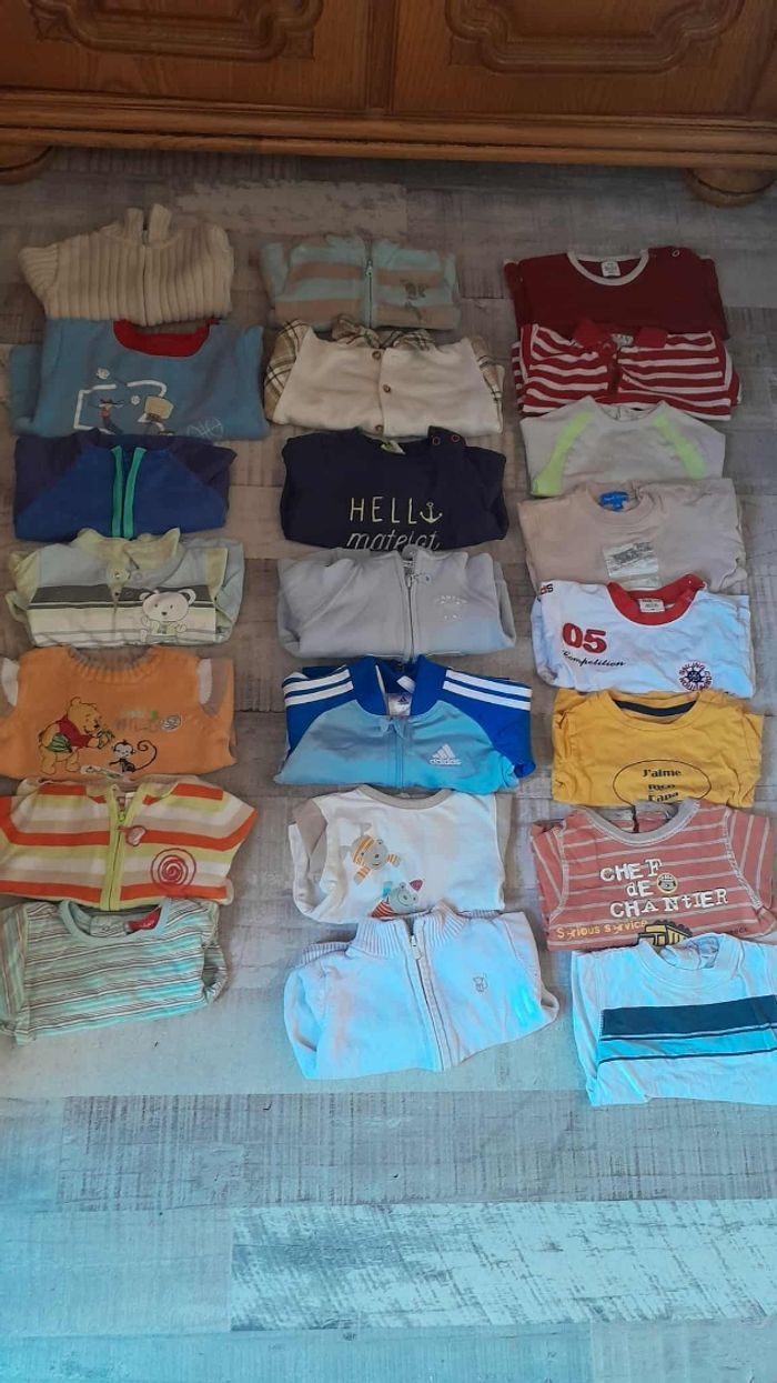 Lot garçon 6/9 mois En très bonne état 12 haut longue manche 7 vestes /gilets 3 pulls/sweat 8 pyjamas 5 chemises 1 ensemble noel 3 barboteuse 7 t shirt manches courtes 5 pantalon 5 short et 1 casquette 6 bodis manches longues 14 bodis manches courtes 1 combi pilote Toutes marques obaibi, Kiabi.... Plus de 70 articles
