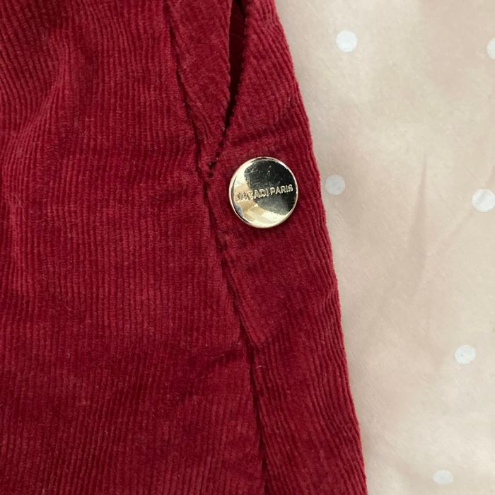 Bonjour, je vous présente une belle robe en velours rouge foncée avec une fermeture sur le côté très peu portée avec des boutons dorés et Jacadi Paris, fermeture avec des boutons intérieur, possibilité de resserrer à l’intérieur avec un élastique, les bretelles au dos, se croisent avec des boutons à l’intérieur