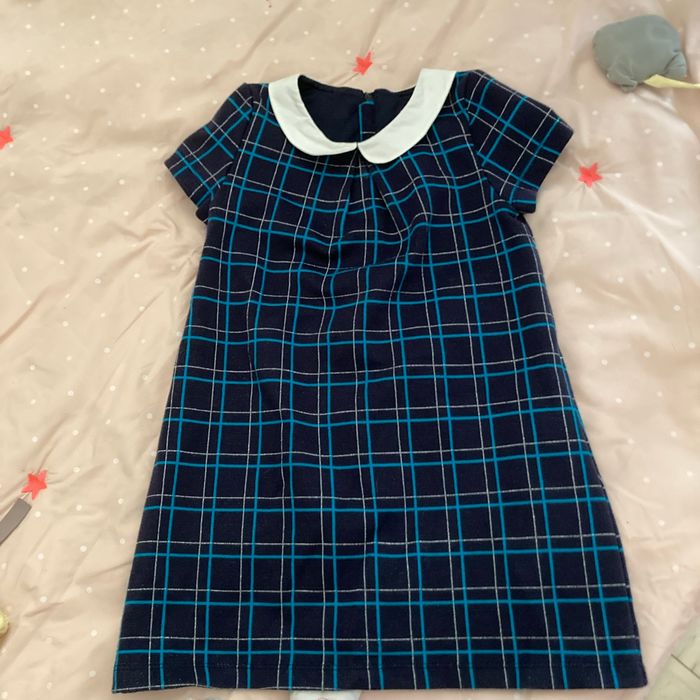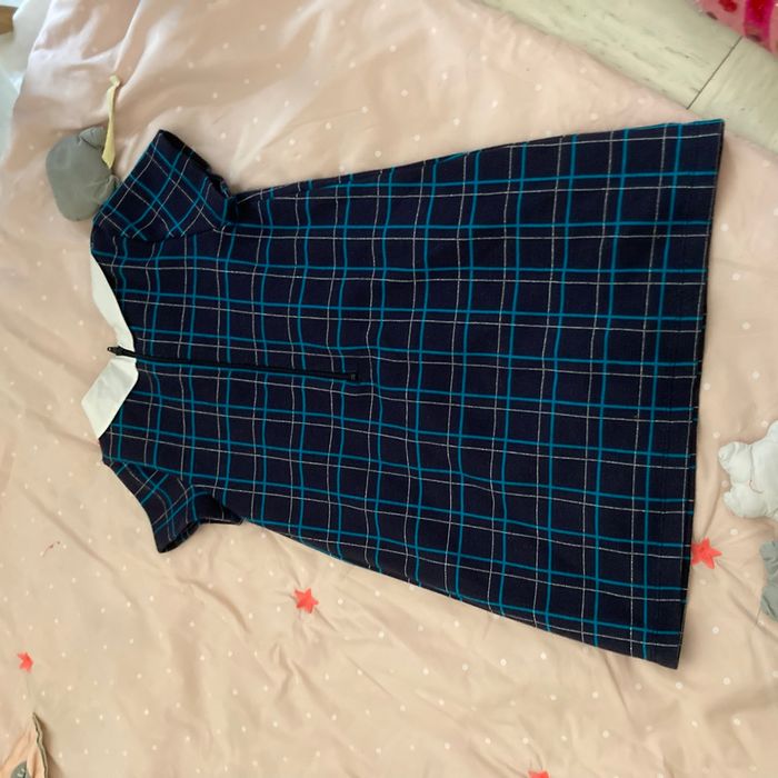 Bonjour, c’est une robe très peu portée avec une fermeture éclair au dos avec le col Claudie, blanc, bleu marine, avec des carrés bleus, turquoise et des rayures argentées. Peu porté.